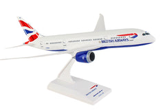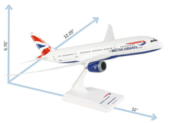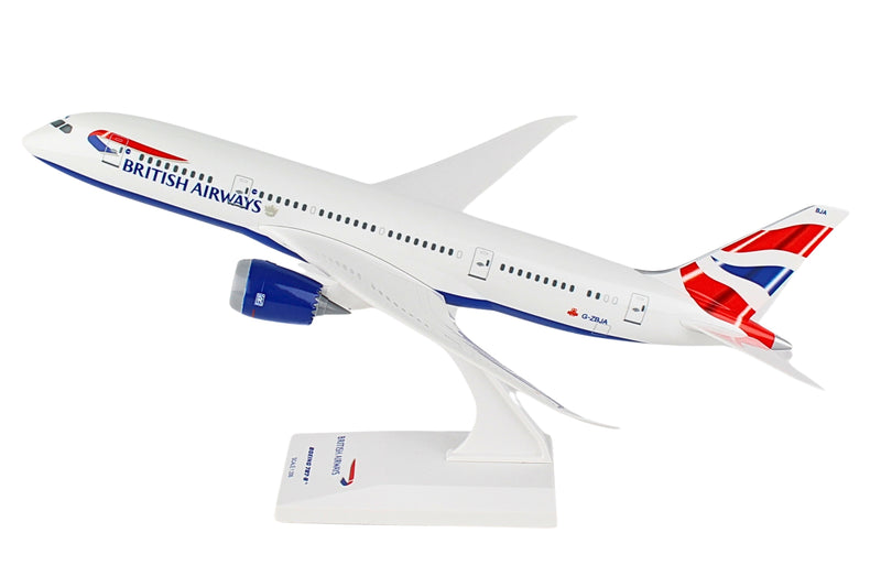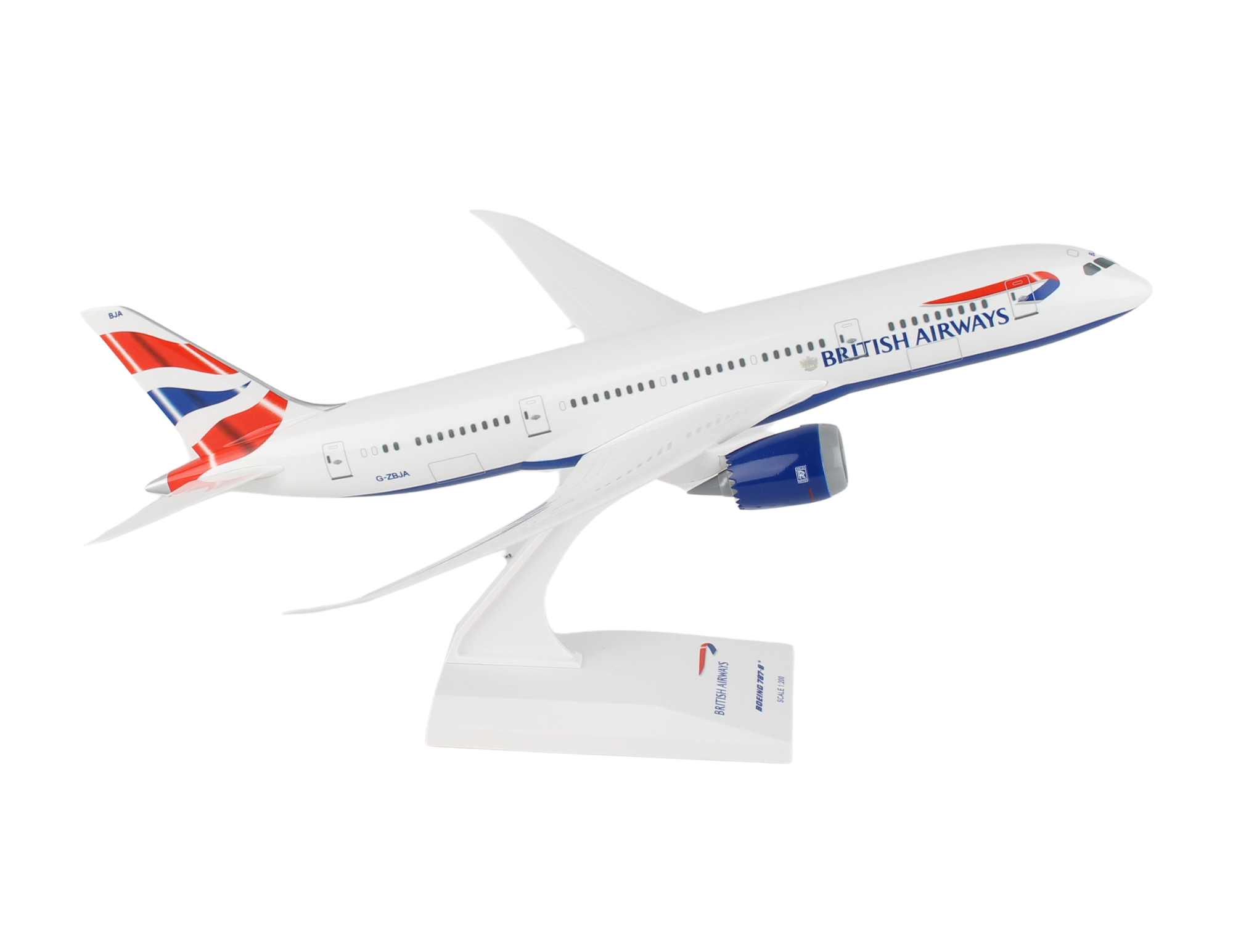Comprising superior quality, solid, substantial injection molded plastic components with a simple snap-fit design that allows for easy assembly without the need for glue, this SkyMarks 1/200 Scale British Airways Boeing 787-8 Dreamliner - Registration G-ZBJA - measures approximately 11-inches long with a 12-1/8-inch wingspan and comes complete with a Display Stand. An accurate, true-to-scale reproduction of the actual aircraft, the model is great for collectors and features authentic, highly detailed graphics and markings. Having entered service in 2011 as a more fuel-efficient, environmentally friendly replacement aircraft for the aging Boeing 767-200ER, the innovative, twin-engine, wide-body Boeing 787-8, which was Boeing's introductory model in the 787 series, was deemed to be an ideal size to accommodate approximately 250 passengers, as market demand for the Boeing 747 and 767 had begun to slow down. With a range of nearly 7,400 nautical miles, the Boeing 787-8 was designed to shift hub-and-spoke travel to new, non-stop, ultra-long-haul, direct point-to-point routes where bigger aircraft could not be accommodated or were financially justifiable. Recognized by its prominently curved wings with raked back wingtips and chevrons on its engine nacelles, the Boeing 787-8 not only provides maximum flying pleasure with a very spacious interior design, larger windows, lower cabin noise and improved oxygen levels, it comprises technologically advanced, state-of-the-art avionics and electronics systems along with an airframe that primarily consists of lightweight composite materials.