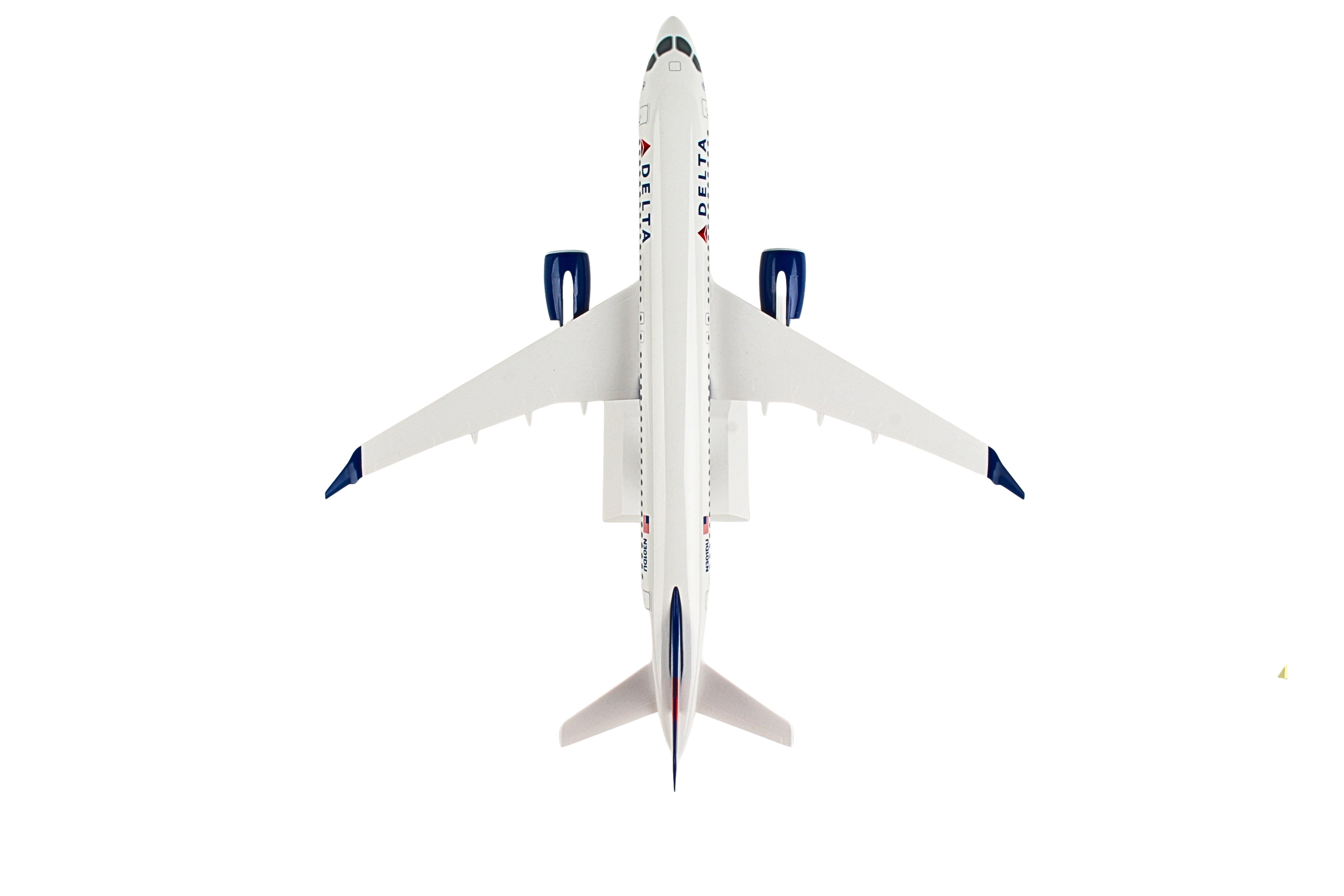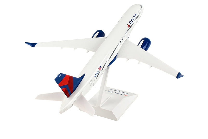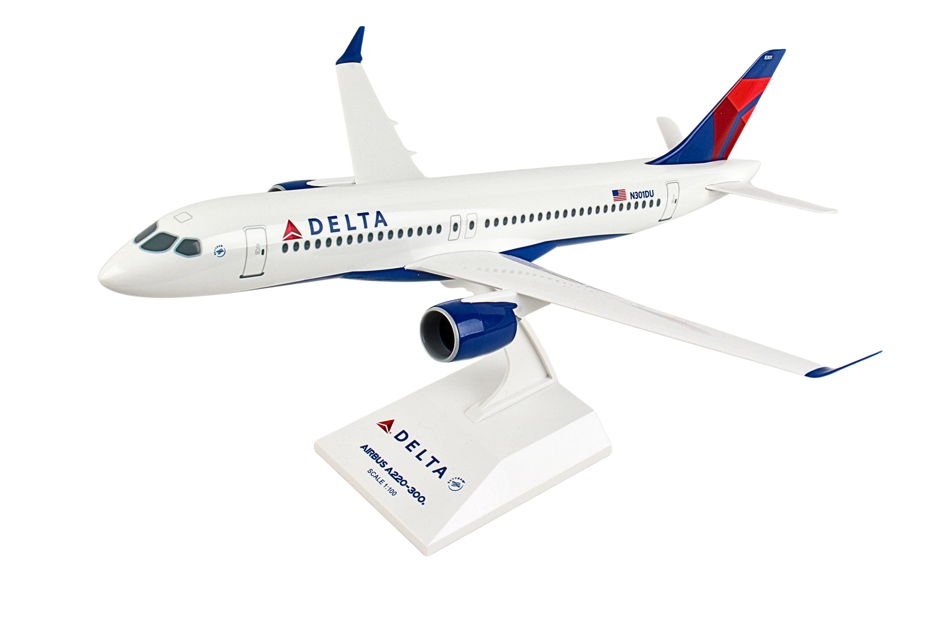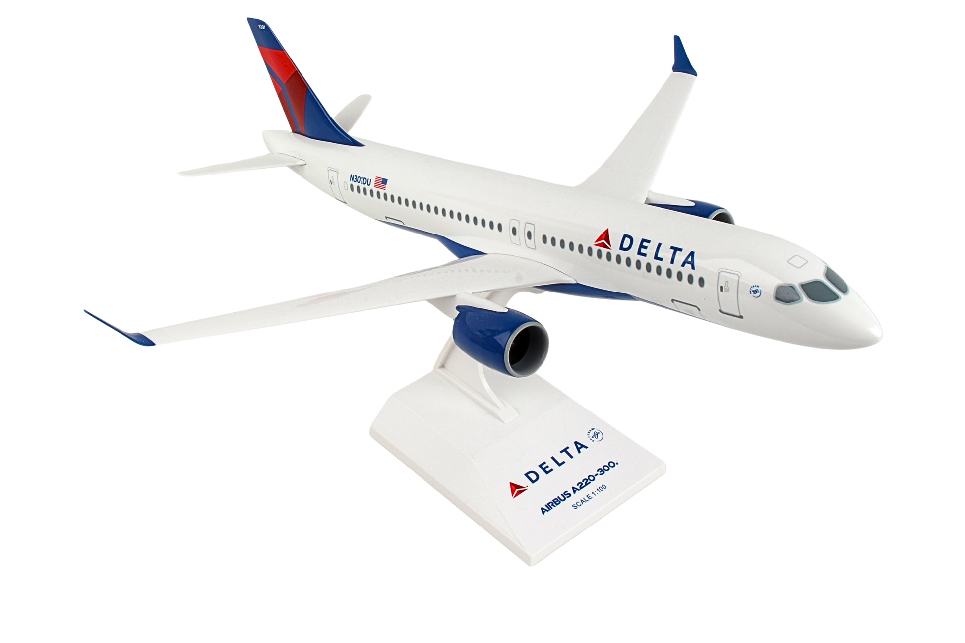 Comprising superior quality, solid, substantial injection molded plastic components with a simple snap-fit design that allows for easy assembly without the need for glue, this SkyMarks 1/100 Scale Delta Airlines Airbus A220-300 - Registration N301DU - measures approximately 15-1/16-inches long with a 13-5/8-inch wingspan and comes complete with a Display Stand. An accurate, true-to-scale reproduction of the actual aircraft, the model is great for collectors and features authentic, highly detailed graphics and markings. The Airbus A220-300, which went into service at the end of 2016 and is larger than the initially introduced Airbus A220-100, is a modern, technologically advanced aircraft that was developed to fly 120-160 passengers up to 3,400 nautical miles in quiet comfort to different points that were either not feasible for several reasons or simply not profitable for the airlines. Recognized by airlines for its efficiency and economical operating costs, the Airbus A220-300, which is nearly identical to the Airbus A220-100 variant in almost all respects, enables airlines to cost effectively fly both versions while allowing pilots and flight crews to easily transition from one model to the other. According to Airbus, even though the Airbus A220 Family is the smallest jetliner in Airbus' commercial aircraft product line, not only does it offer unbeatable comfort, with its large seats, ample storage space and large windows, it is a single aisle aircraft that feels like a widebody jet.