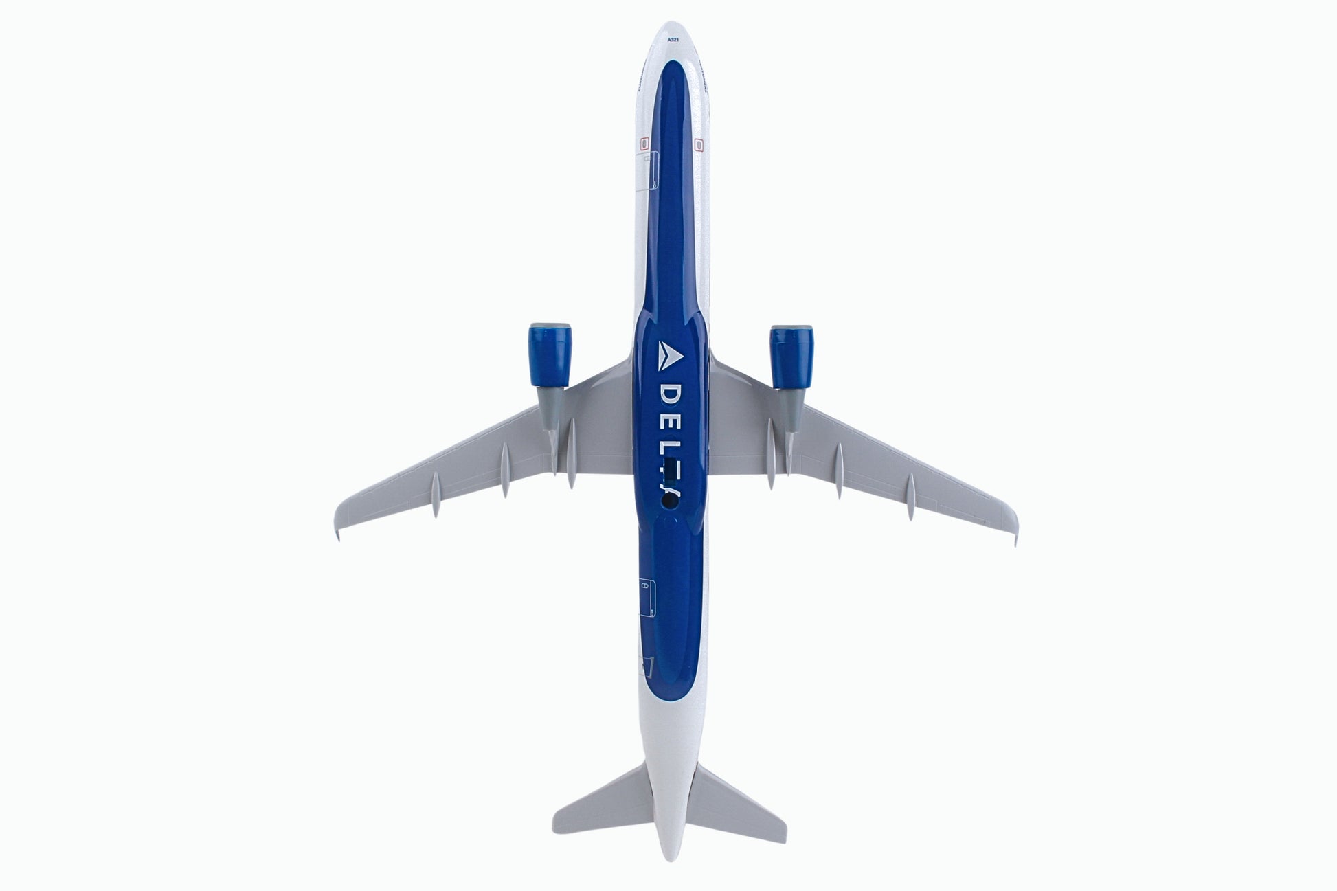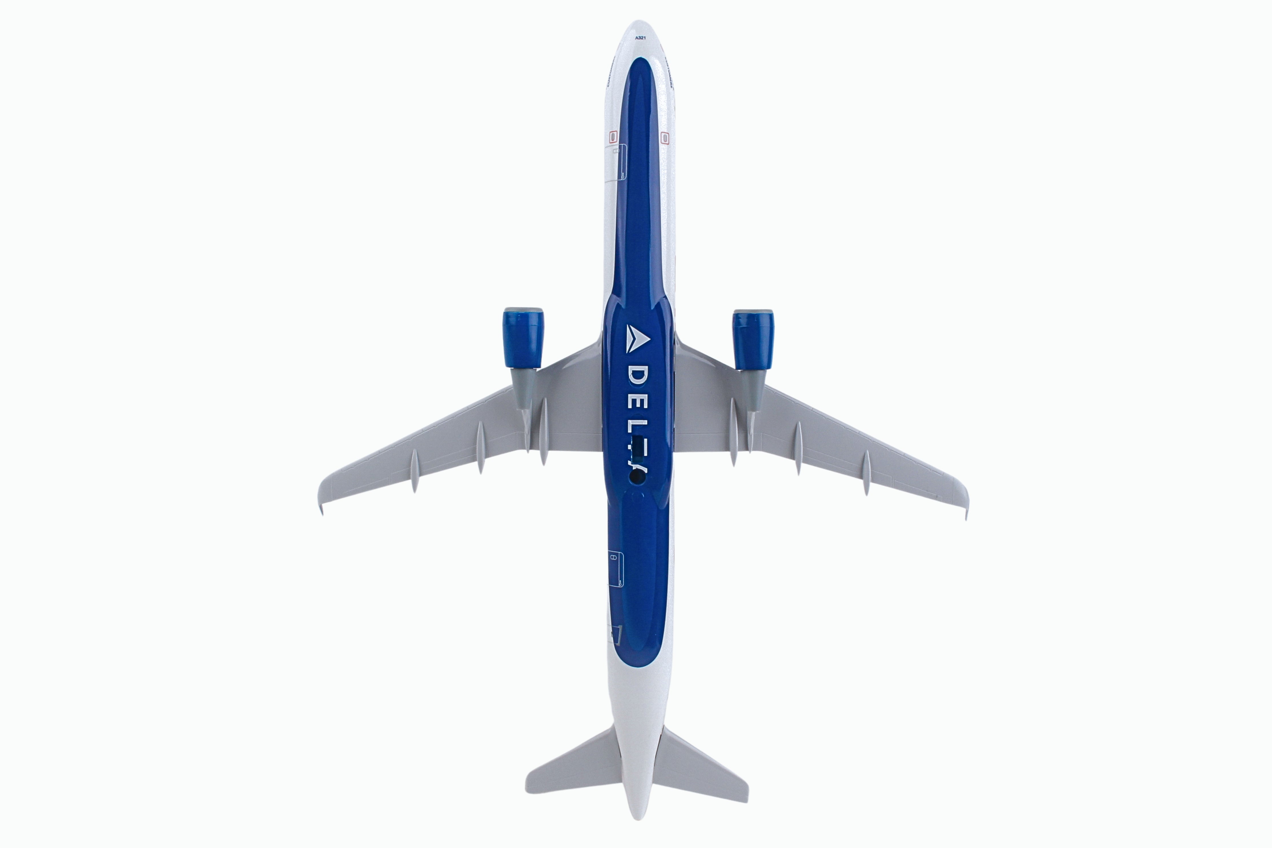 Comprising superior quality, substantial, solid injection molded plastic components with a simple snap-fit design that allows for easy assembly without the need for glue, this SkyMarks 1/150 Scale Delta Airlines Airbus A321 - with Registration N391DN - measures approximately 11-5/8-inches long with a 9-5/8-inch wingspan and comes complete with a Display Stand. An accurate, true-to-scale reproduction of the actual aircraft, the model is great for collectors and features authentic, highly detailed graphics and markings. As a symbol of its appreciation for its employees and customers, this Delta Airlines Airbus A321 features a very prominent THANK YOU message, which spans across its fuselage and includes all 90,000 of its employee names alongside a second message near the airplane's nose under the flightdeck asserting that this plane is DEDICATED TO THE WORLD'S BEST EMPLOYEES AND CUSTOMERS. A derivative of the Airbus A320 with a stretched fuselage, the Airbus A321, which went into service in 1994, is a narrow body, short to medium range, twin engine commercial jet that can be configured to typically carry 185 to 236 passengers. To give the Airbus A321 full-transcontinental range with maximum passenger capacity, Airbus began development of the next version of its A321 in 1995, the A321-200, that entered service in 1997 as a larger and heavier aircraft than the earlier A321 with minor structural strengthening modifications, higher thrust engines, and additional fuel tanks.