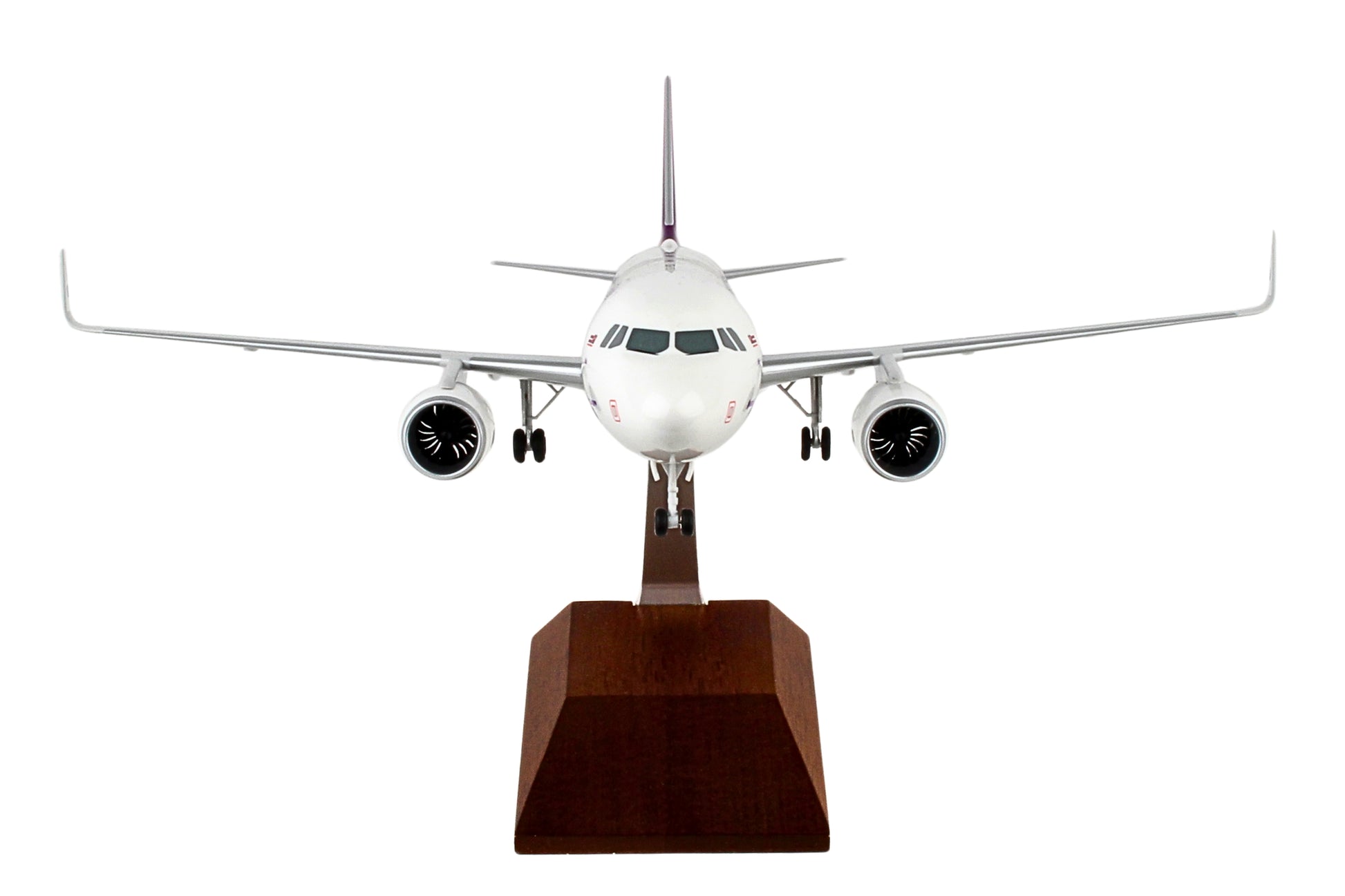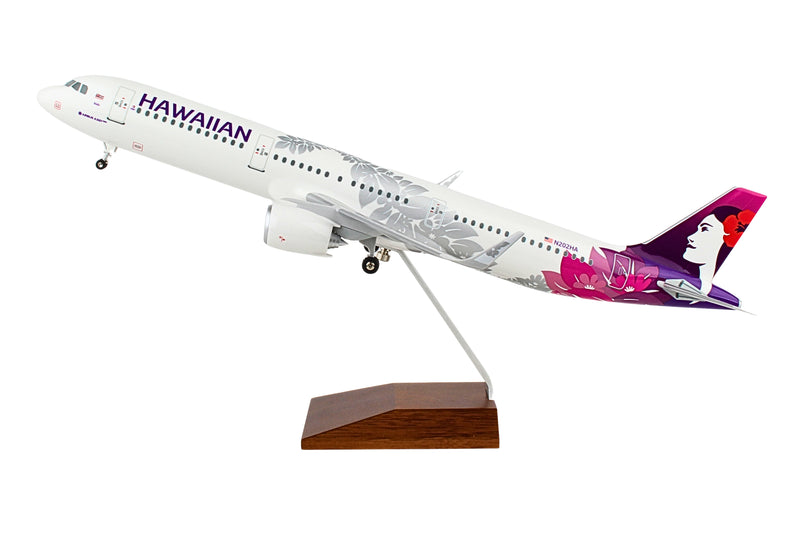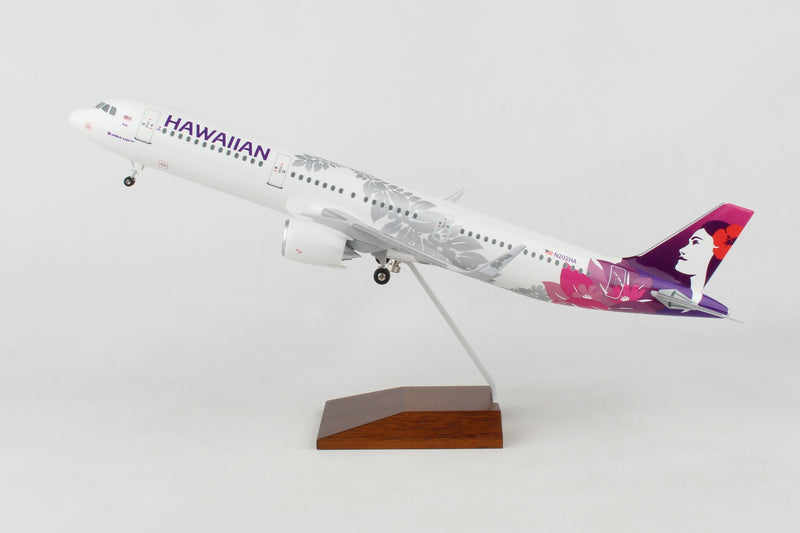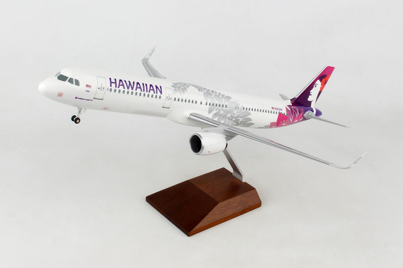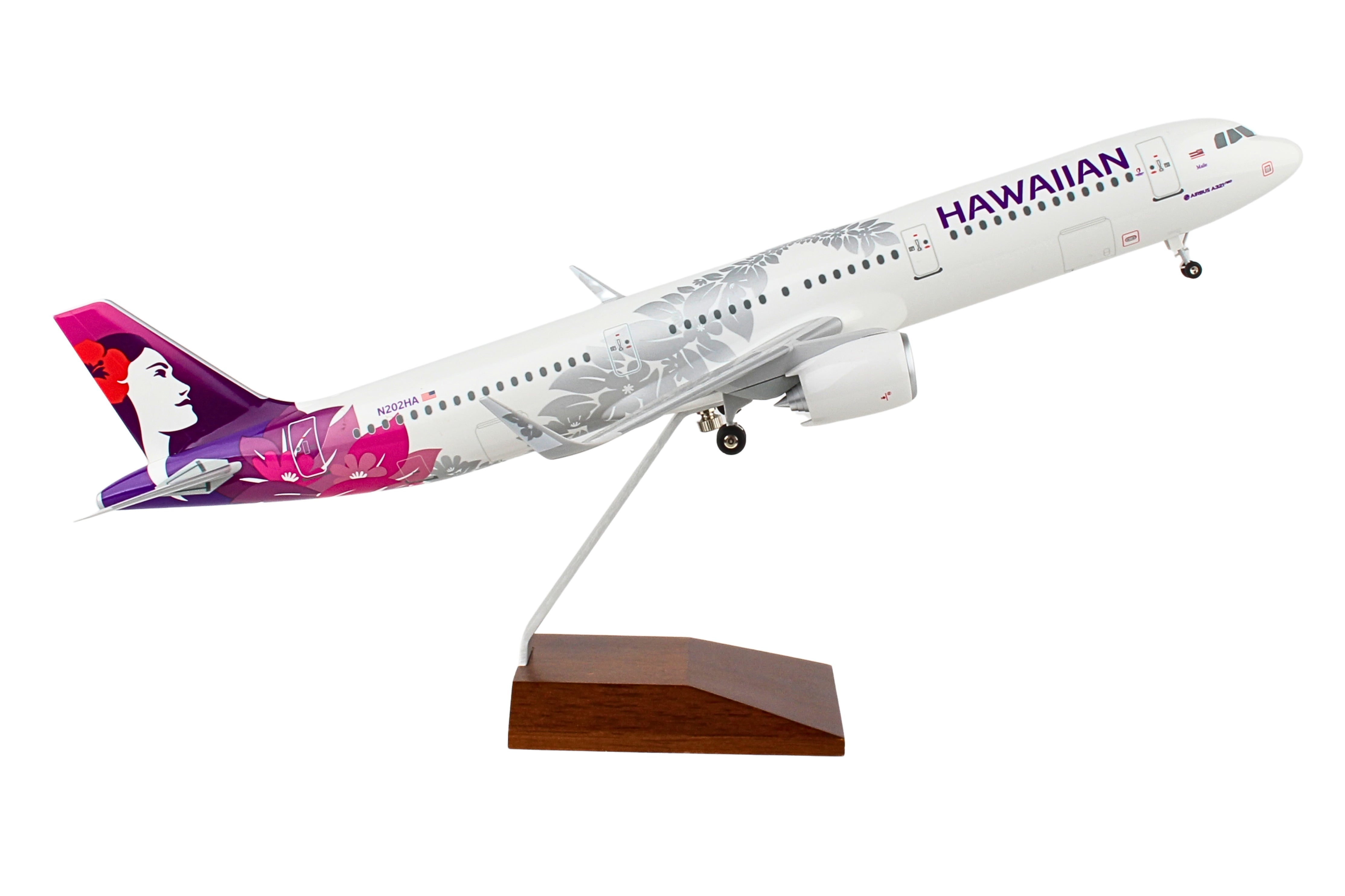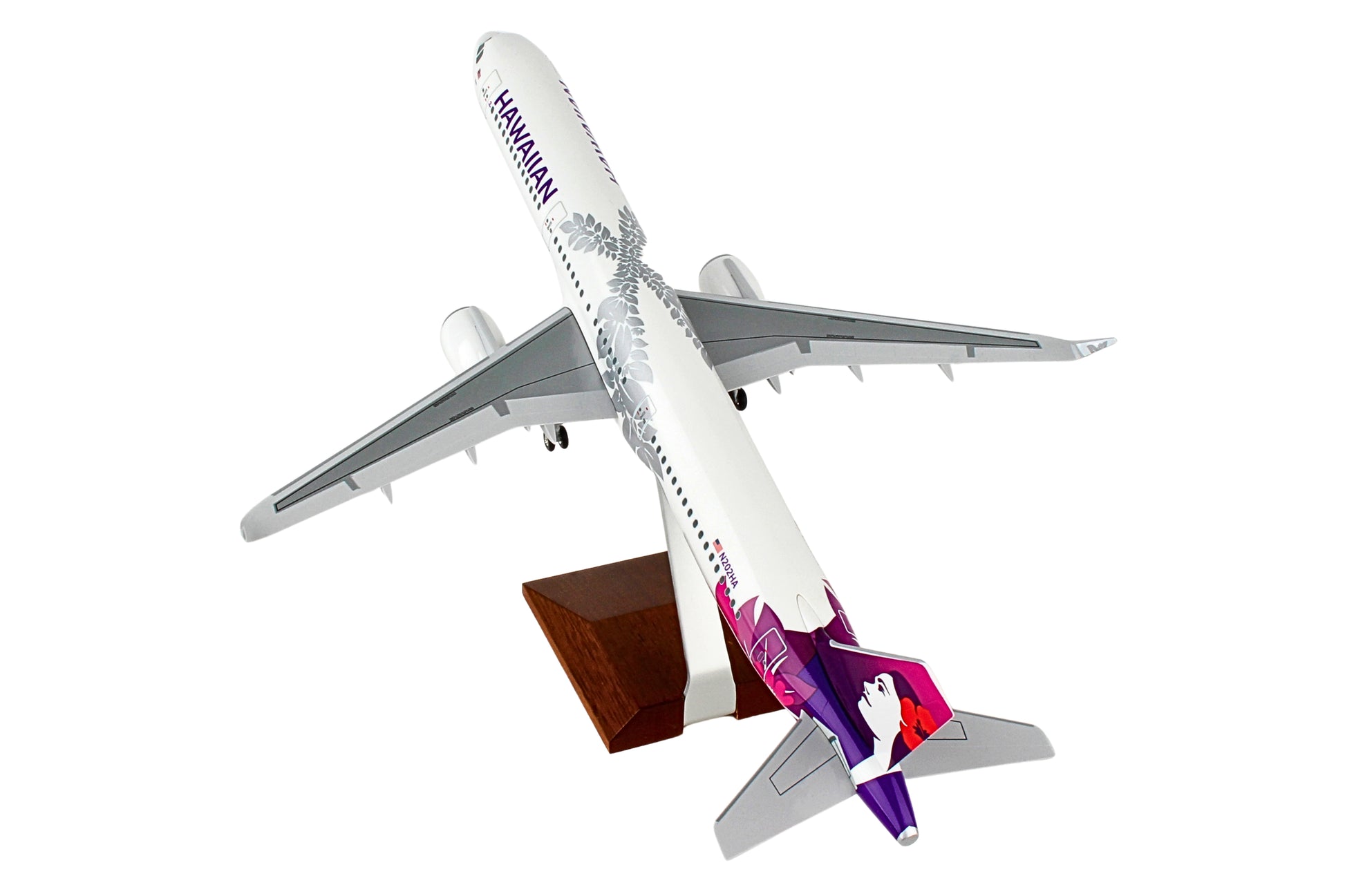 This Hawaiian Airlines A321 features solid fuselage, injection molded plastic construction with highly detailed graphics. Model comes with landing gear, spinning engines & rich wood display stand. Full model can be assembled in minutes! The airplane model is approximately 17.5 inches in length and has a 13.5 inch wingspan.