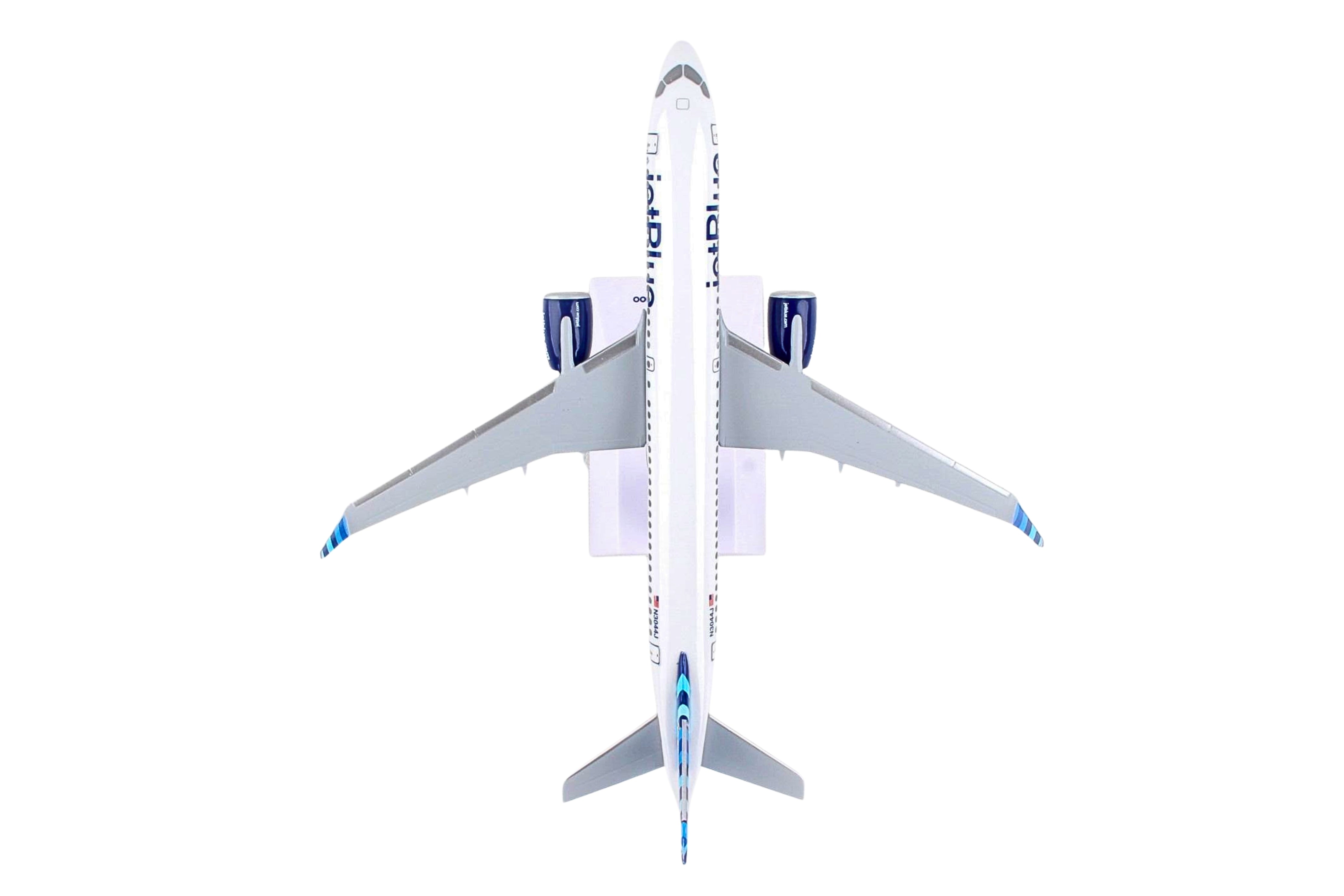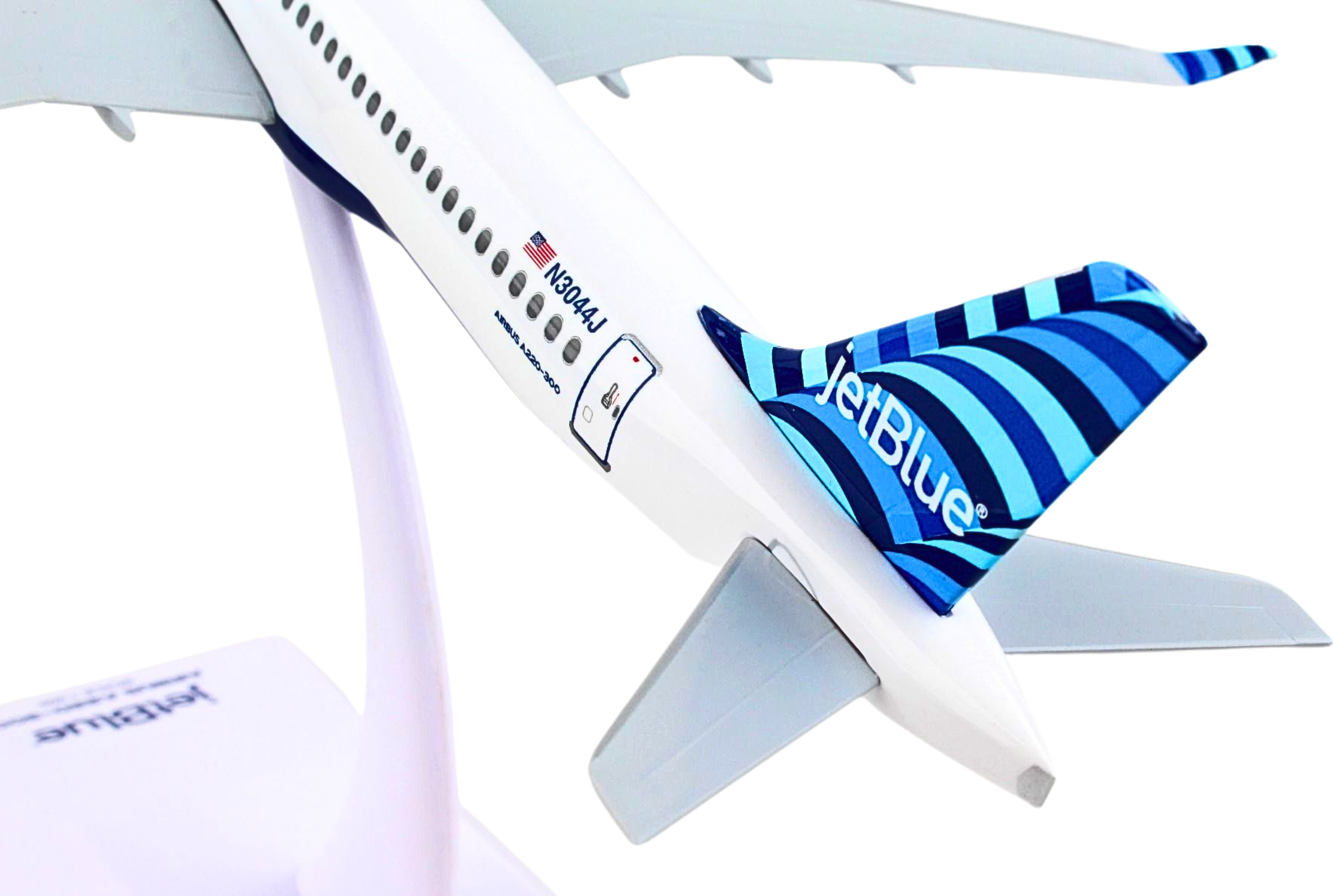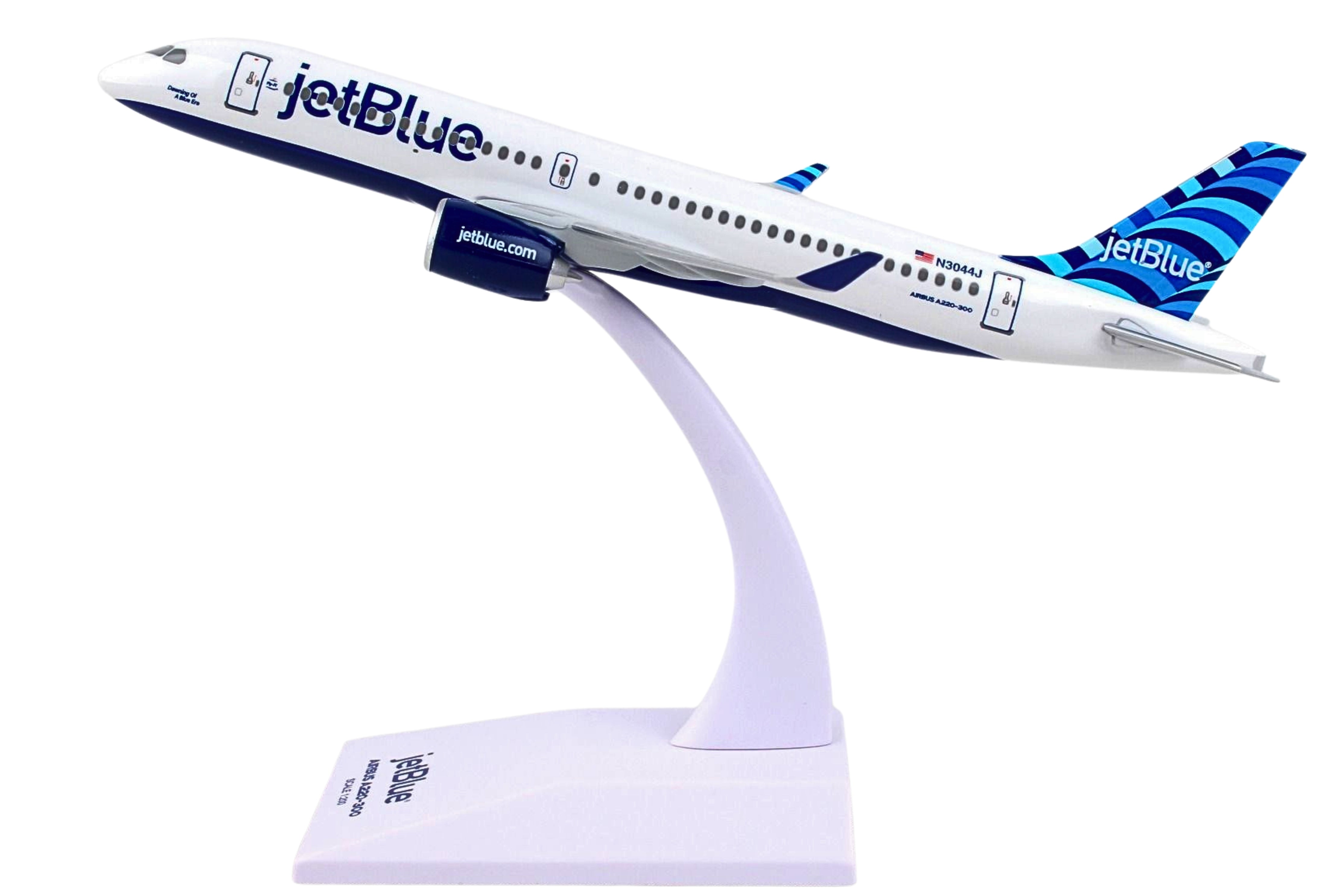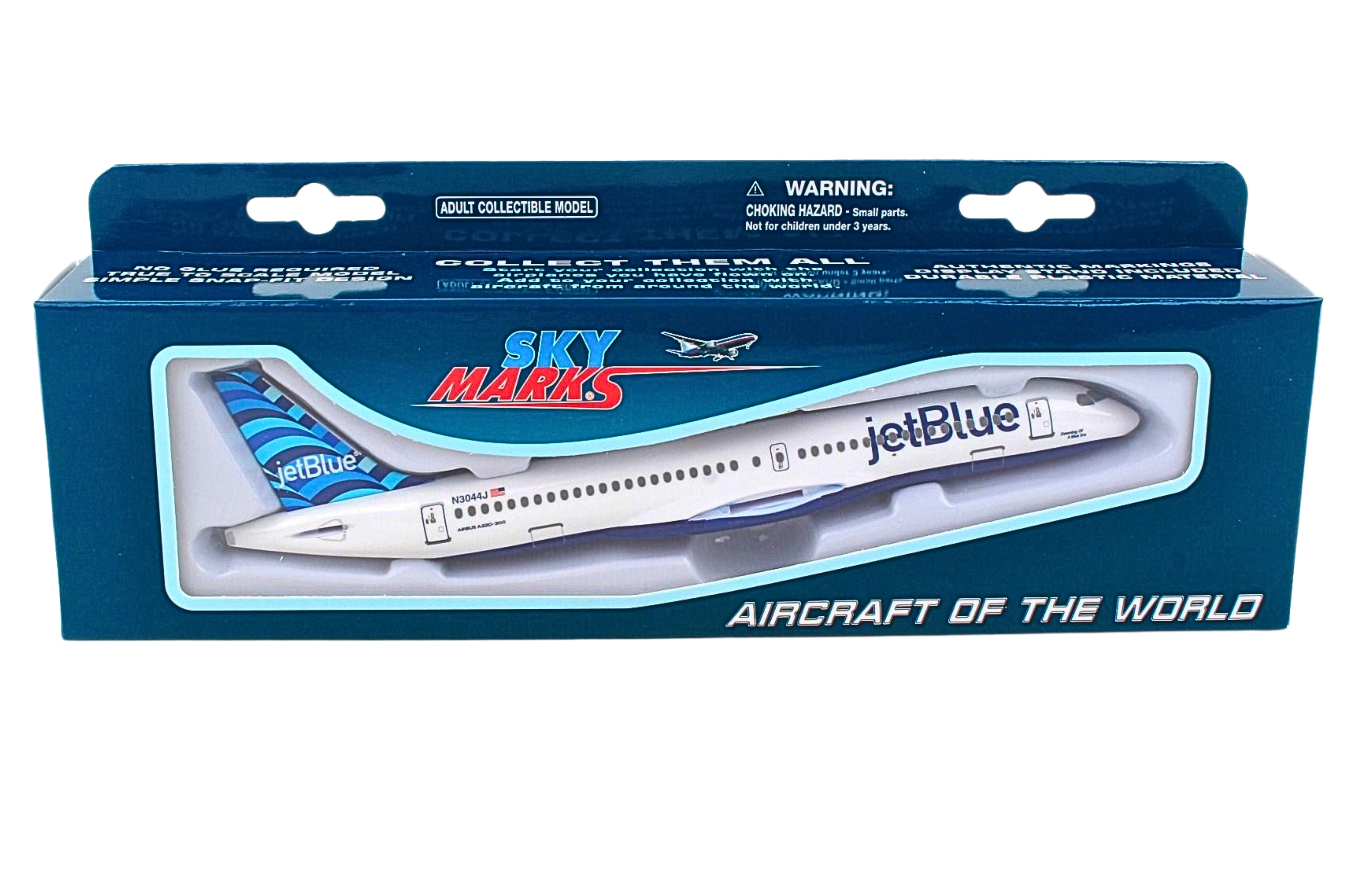 Comprising superior quality, solid, substantial injection molded plastic components with a simple snap-fit design that allows for easy assembly without the need for glue, this SkyMarks 1/200 Scale jetBlue Airbus A220-300 - Registration N3044J - with Tailfin named Dawning of a Blue Era - measures approximately 7-3/8-inches long with a 6-1/4-inch wingspan and comes complete with a Display Stand. An accurate, true-to-scale reproduction of the actual aircraft, the model is great for collectors and features authentic, highly detailed graphics and markings. The Airbus A220-300, which went into service at the end of 2016 and is larger than the initially introduced Airbus A220-100, is a modern, technologically advanced aircraft that was developed to fly 120-160 passengers up to 3,400 nautical miles in quiet comfort to different points that were either not feasible for several reasons or simply not profitable for the airlines. Recognized by airlines for its efficiency and economical operating costs, the Airbus A220-300, which is nearly identical to the Airbus A220-100 variant in almost all respects, enables airlines to cost effectively fly both versions while allowing pilots and flight crews to easily transition from one model to the other. According to Airbus, even though the Airbus A220 Family is the smallest jetliner in Airbus' commercial aircraft product line, not only does it offer unbeatable comfort, with its large seats, ample storage space and large windows, it is a single aisle aircraft that feels like a widebody jet.