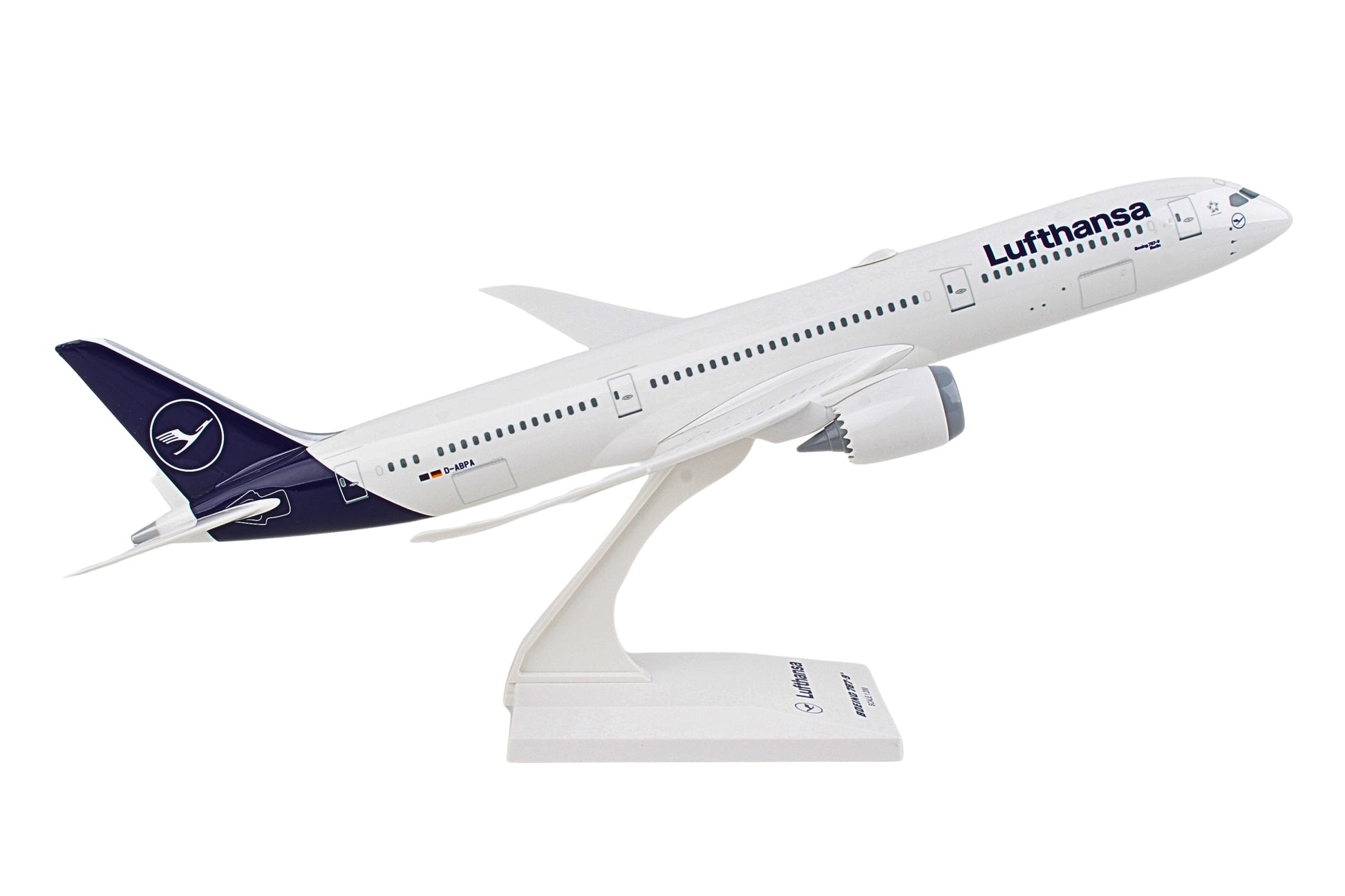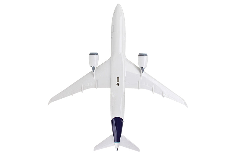 Comprising superior quality, substantial, solid injection molded plastic components with a simple snap-fit design that allows for easy assembly without the need for glue, this SkyMarks 1/200 Scale Lufthansa Boeing 787-9 measures approximately 12-3/8-inches long with a 12-1/8-inch wingspan and comes complete with a Display Stand. An accurate, true-to-scale reproduction of the actual aircraft, this Lufthansa Boeing 787-9, which is manufactured as an officially licensed product, is great for collectors and features authentic, highly detailed graphics and markings. Having commenced service with the introduction of the Boeing 787-8 Dreamliner in 2011 as a more fuel-efficient, environmentally friendly successor to the aging Boeing 767, as market demand for the Boeing 747 and 767 had begun to slow down, the innovative, twin engine, wide-body Boeing 787 Dreamliner is currently offered in three different versions that can be configured to seat from 248 up to 336 passengers and is recognized by its prominently curved aerodynamic wings with raked back wingtips and chevrons on its engine nacelles. Technologically advanced with state-of-the-art avionics, electronics systems and an airframe that primarily comprises lightweight composite materials, the Boeing 787 Dreamliner can fly ultra-long-haul, non-stop, point-to-point routes up to 8,500 nautical miles where bigger aircraft cannot be accommodated or are financially justifiable, and offers improved cabin noise and oxygen levels, larger windows, and a very spacious interior design for maximum flying pleasure. Intended to replace the aging Boeing 767-300ER, the Boeing 787-9, which went into service in 2014, is a lengthened version of the launch version Boeing 787-8 with a higher maximum takeoff weight, and because of its increased range over the launch model, can fly 296 passengers to an even greater number of non-stop routes with exceptional efficiency.