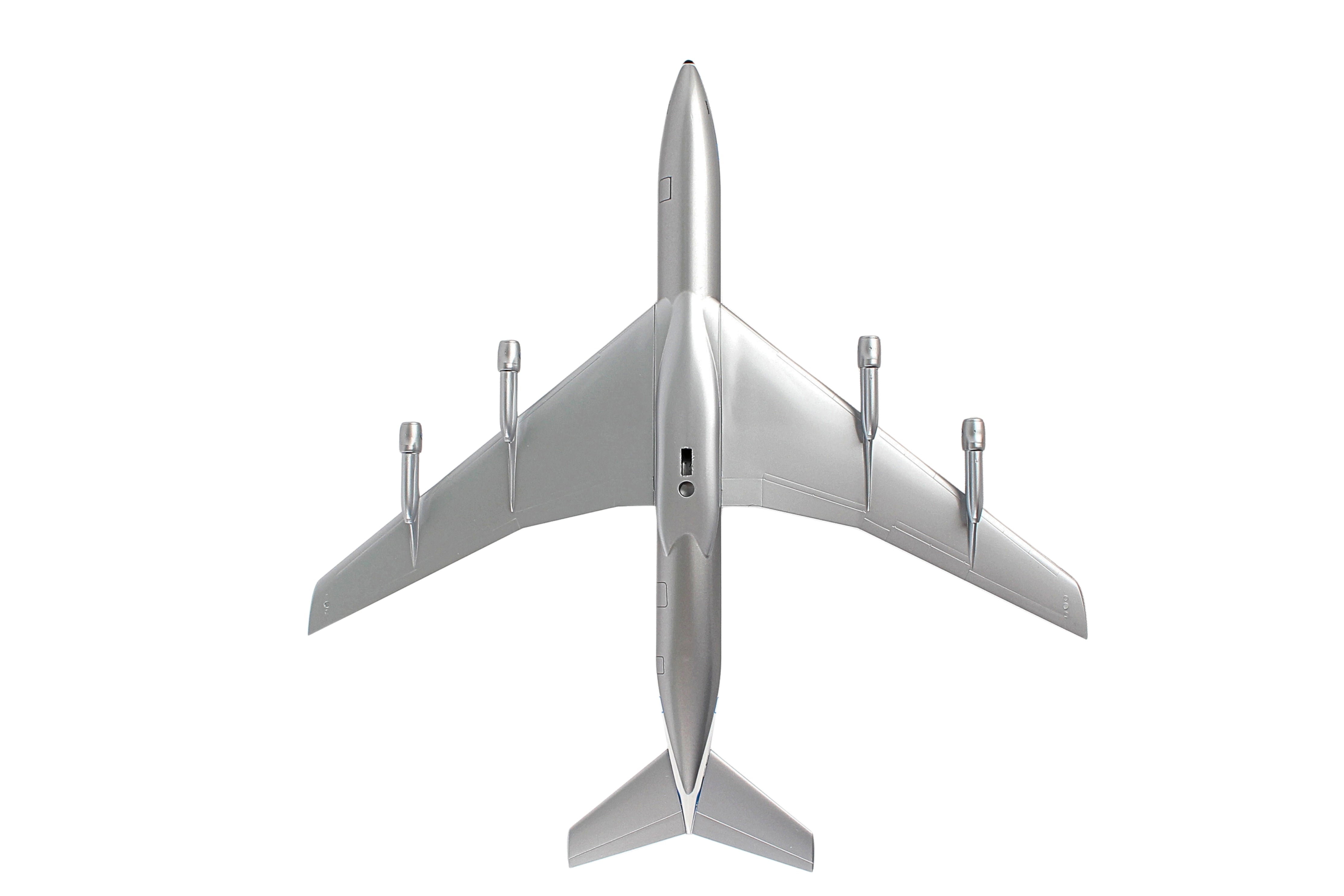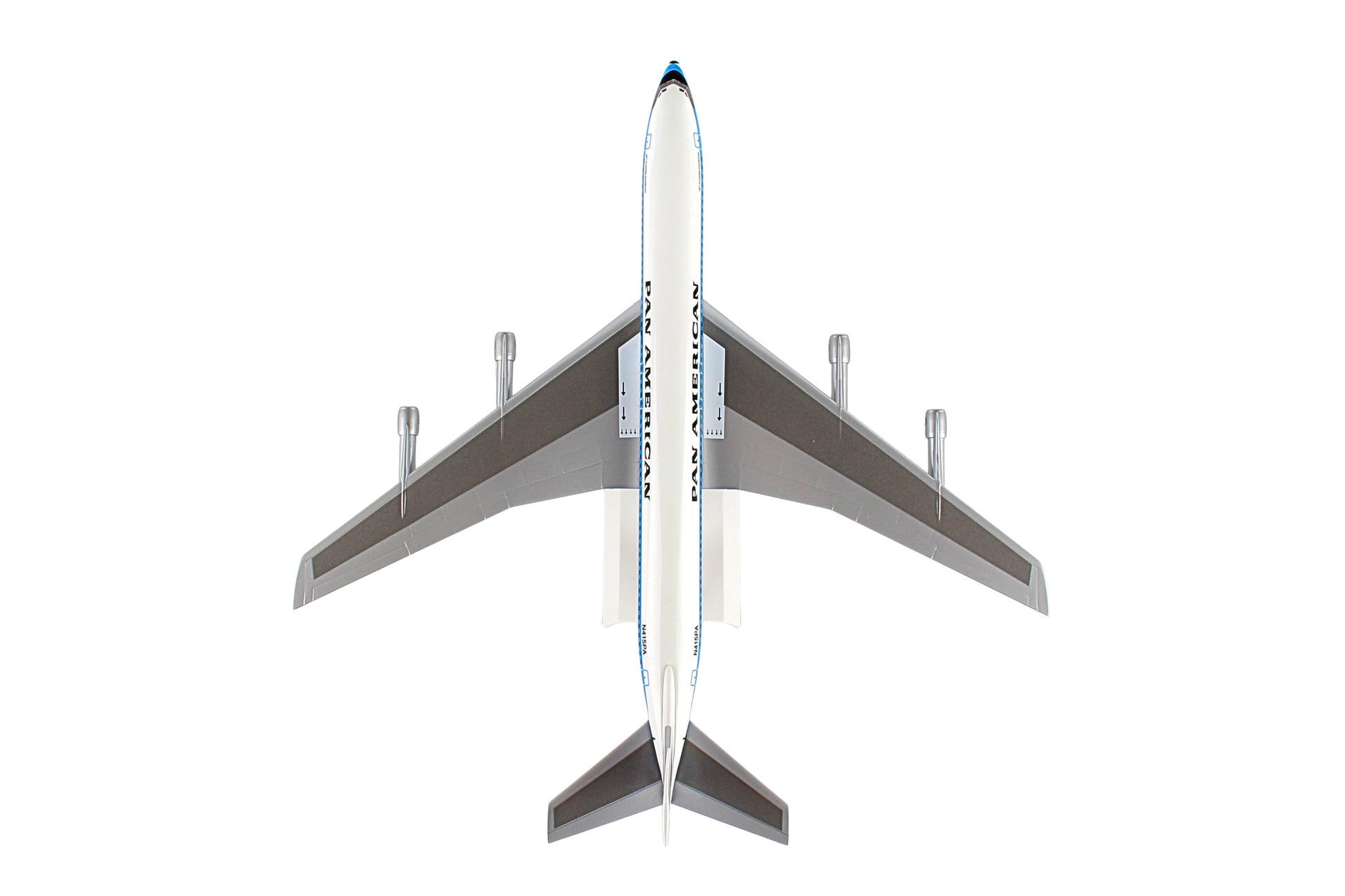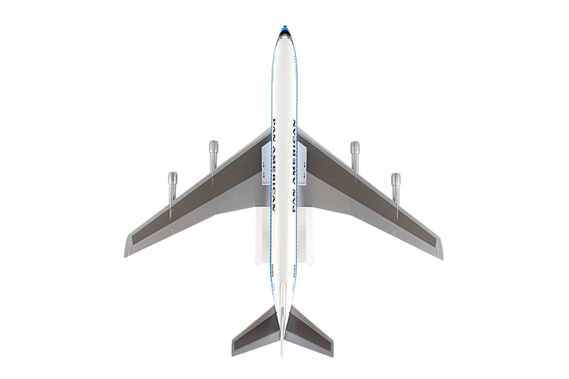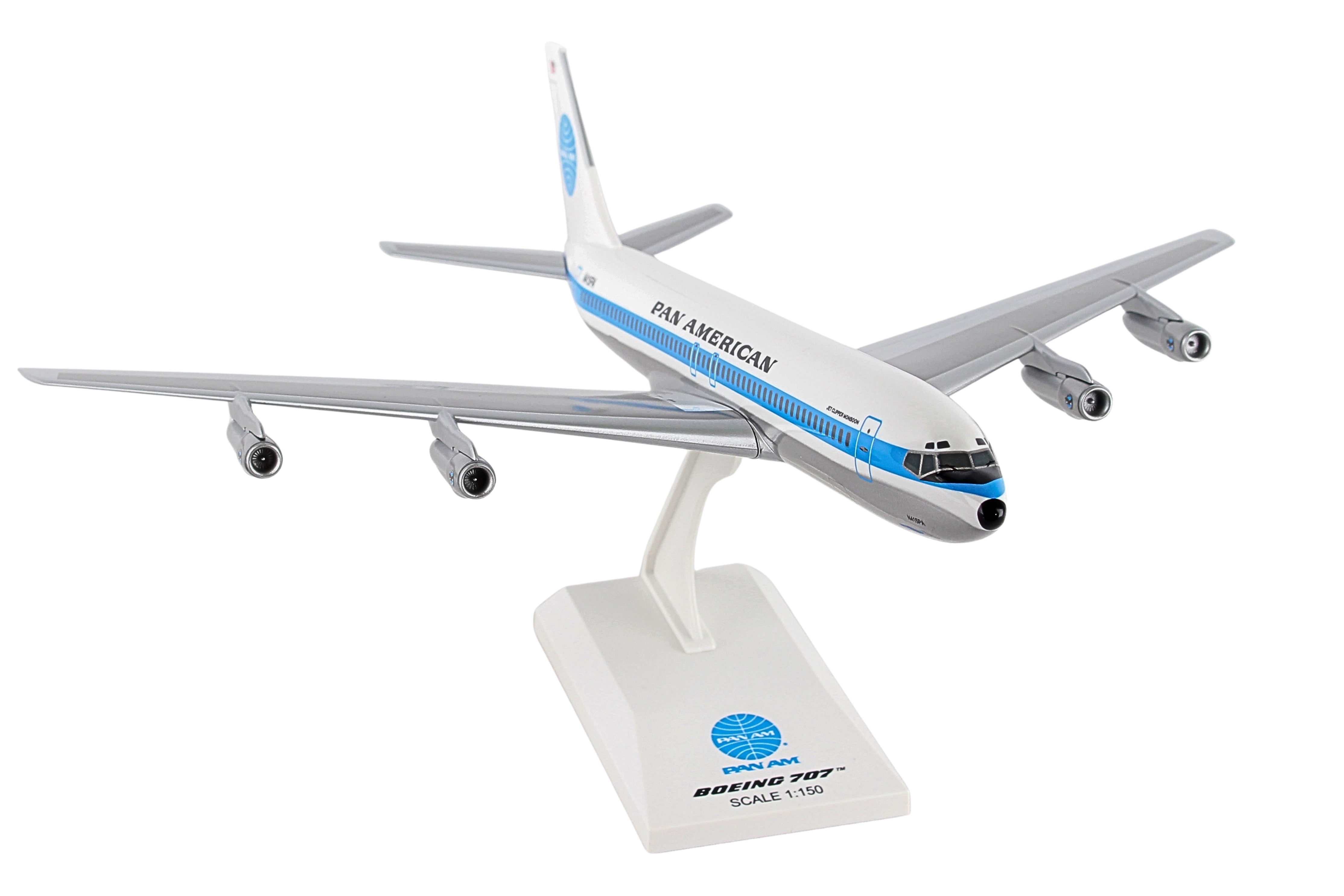 Comprising superior quality, solid injection molded plastic components with a simple snap-fit design that allows for easy assembly without the need for glue, SkyMarks 1/150 Scale Pan American Boeing 707 measures approximately 12-inches long with an 11-inch wingspan and comes complete with a Display Stand. An accurate, true-to-scale reproduction of the actual aircraft, the model is great for collectors and features authentic, highly detailed graphics and markings. Pan Am was the launch customer for the Boeing 707, which went into service in October 1958 with its first scheduled flight from New York Idlewild - now JFK - to Paris Le Bourget, with a stop at Gander to refuel. The Boeing 707 was developed as a long range, intercontinental, narrow body aircraft that could carry approximately 200-passengers, and has not only been credited with having initiated the jet age, it was also the most popular jetliner of its time.