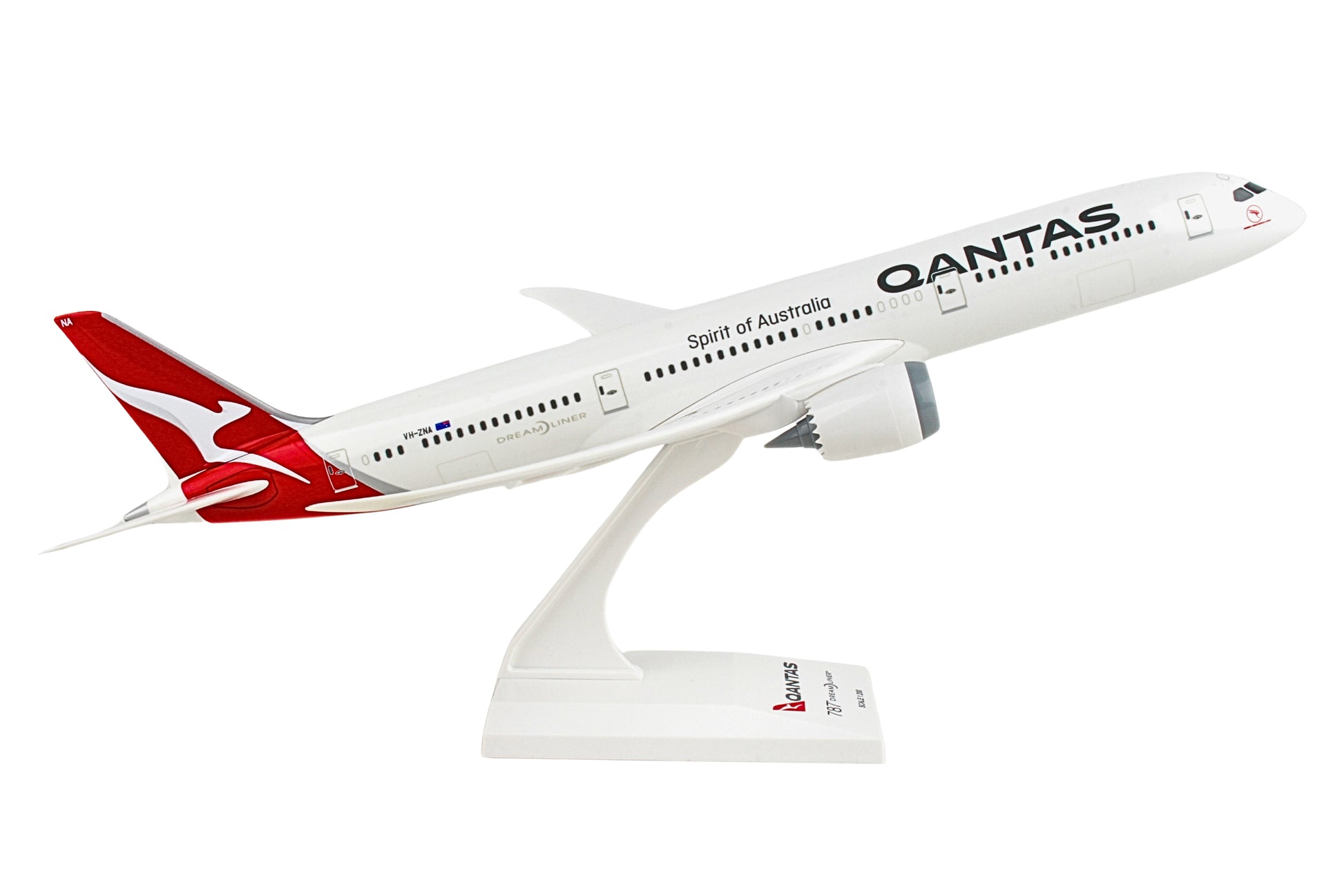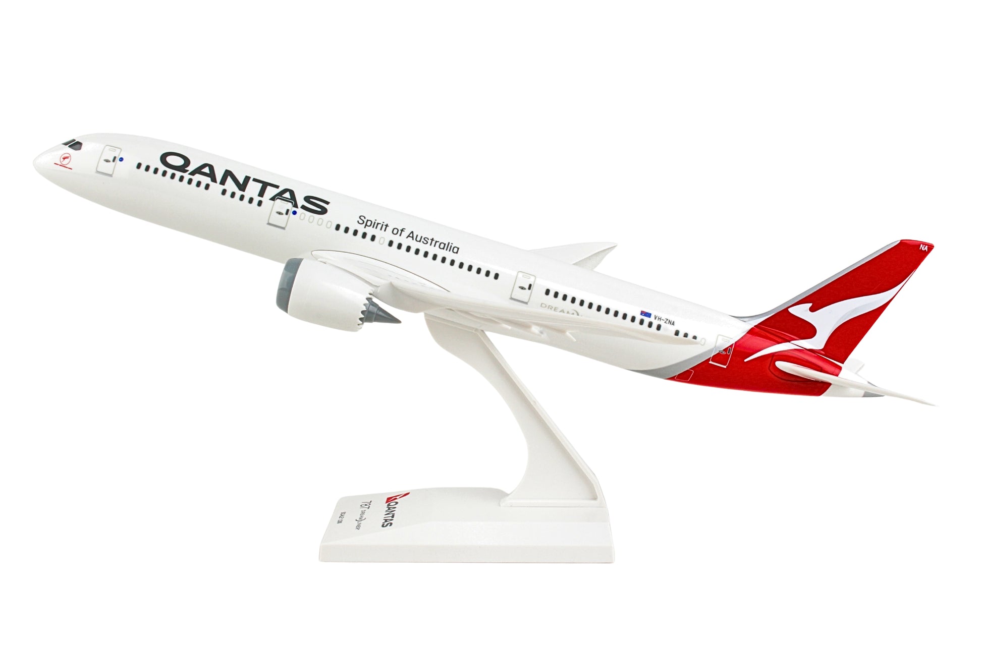 Comprising superior quality, solid, substantial injection molded plastic components with a simple snap-fit design that allows for easy assembly without the need for glue, this SkyMarks 1/200 Scale Qantas Boeing 787-9 Dreamliner - Registration VH-ZNA - measures approximately 12-3/8-inches long with a 12-1/8-inch wingspan and comes complete with a Display Stand. An accurate, true-to-scale reproduction of the actual aircraft, the model is great for collectors and features authentic, highly detailed graphics and markings. Having commenced service with the introduction of the Boeing 787-8 Dreamliner in 2011 as a more fuel-efficient, environmentally friendly successor to the aging Boeing 767, as market demand for the Boeing 747 and 767 had begun to slow down, the innovative, twin engine, wide-body Boeing 787 Dreamliner is currently offered in three different versions that can be configured to seat from 248 up to 336 passengers and is recognized by its prominently curved aerodynamic wings with raked back wingtips and chevrons on its engine nacelles. Technologically advanced with state-of-the-art avionics, electronics systems and an airframe that primarily comprises lightweight composite materials, the Boeing 787 Dreamliner can fly ultra-long-haul, non-stop, point-to-point routes up to 8,500 nautical miles where bigger aircraft cannot be accommodated or are financially justifiable, and offers improved cabin noise and oxygen levels, larger windows, and a very spacious interior design for maximum flying pleasure. Intended to replace the aging Boeing 767-300ER, the Boeing 787-9, which went into service in 2014, is a lengthened version of the launch version Boeing 787-8 with a higher maximum takeoff weight, and because of its increased range over the launch model, can fly 296 passengers to an even greater number of non-stop routes with exceptional efficiency.