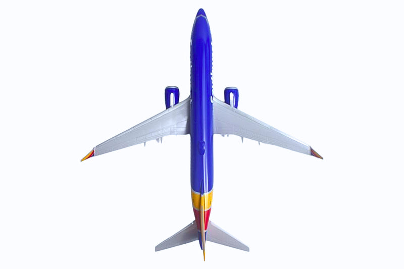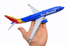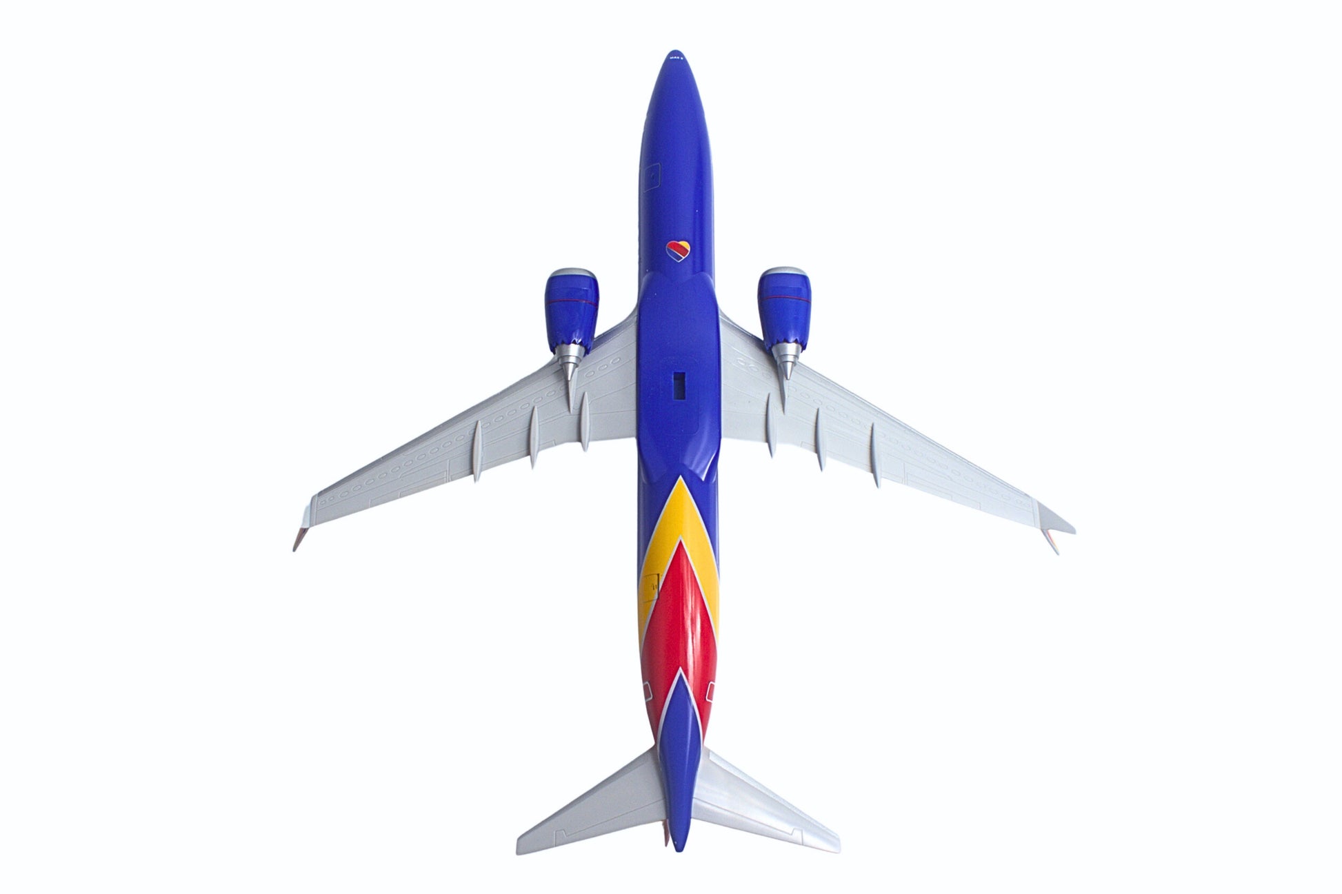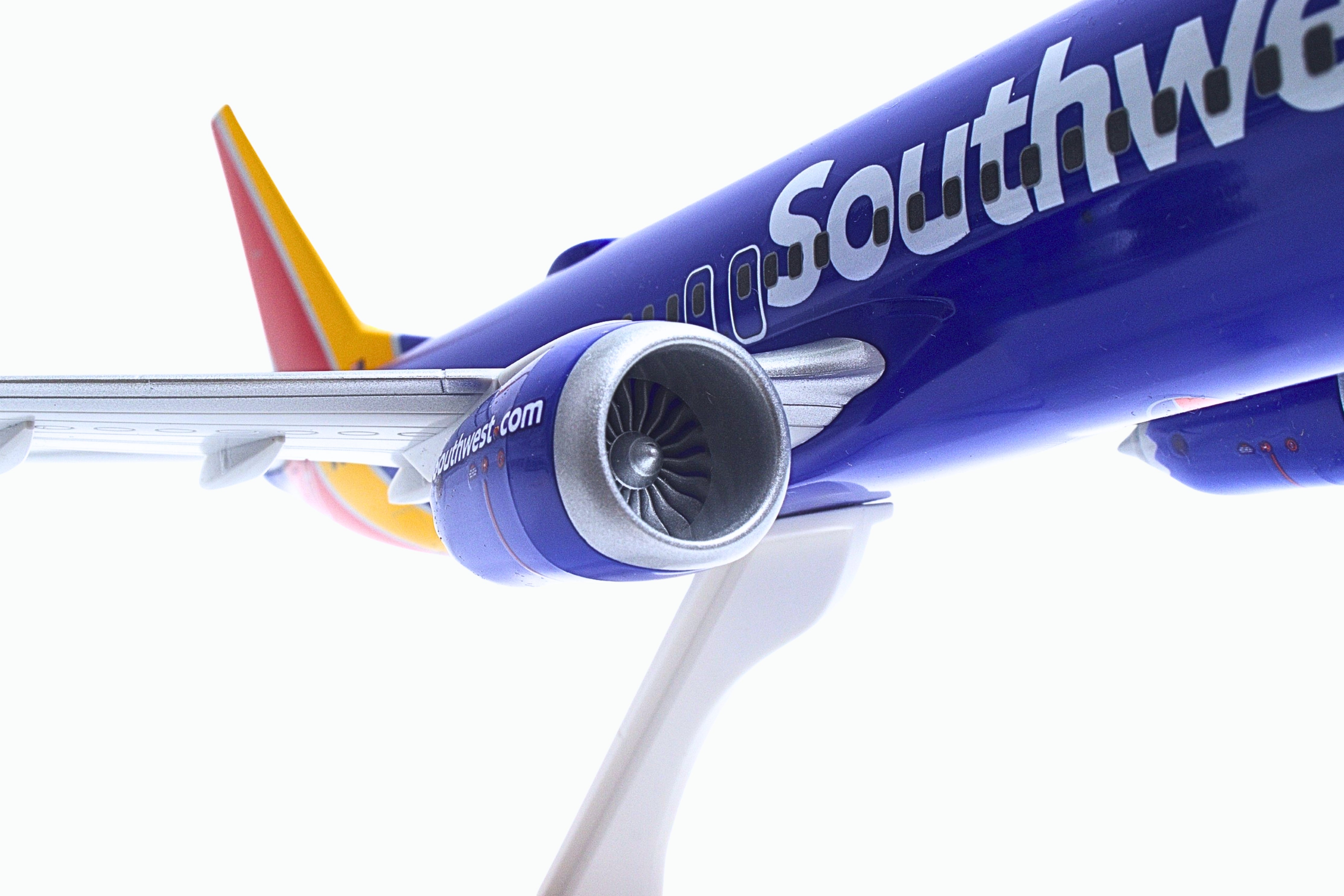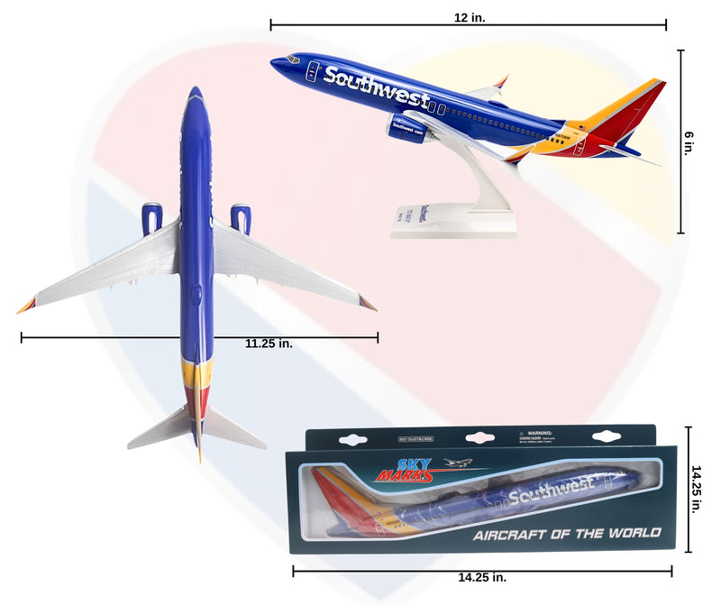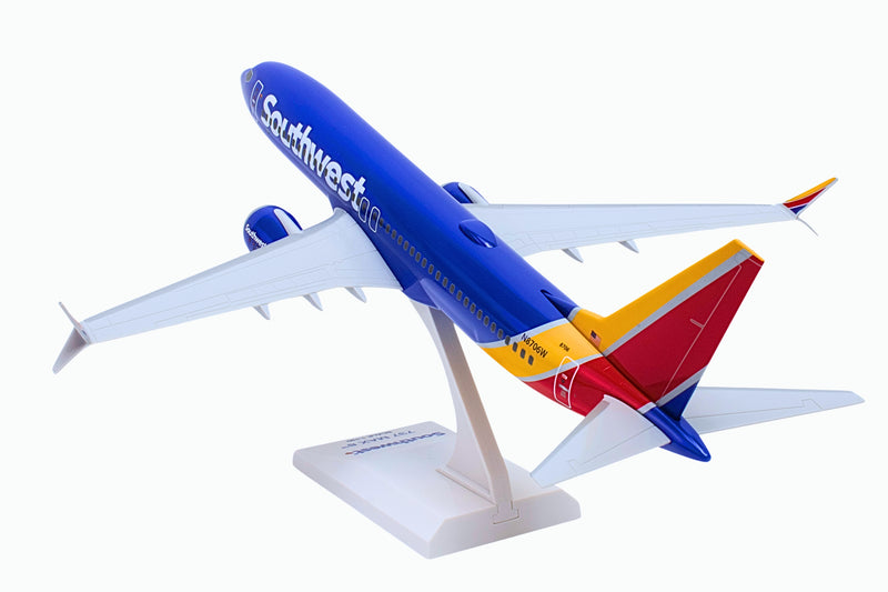 This injected-molded plastic airplane model replica of the 737 MAX 8 comes in 1:130 scale with a wifi dome and display stand, and is approximately 12 inches long with an 11 1/4 inch wingspan. It is specially designed for adult collectors and appropriate for ages 14+. The 737 MAX 8 first flew in 2016 and went into full service in 2017. With a length of 129 feet by 8 inches, and a wingspan of 117 feet and 10 inches, the aircraft is a favorite of airlines due to its incorporation of new technology and efficiency. It has a cruising speed of 606.1 miles (975.4 kilometers) per hour, can reach a height of 41,000 miles, and seat between 160 and 200 passengers. The Southwest Airlines Heart Livery adorns their fleet of 737 Max 8 airplanes, giving passengers a colorful flight. The Silver honors the company's heritage, Blue expresses its commitment to exploration, Red emphasizes customer service, and Yellow signifies bold heights ahead. As of 2023, there are over 700 MAX 8 airplanes actively flying with Southwest Airlines operating nearly 160 aircraft.
