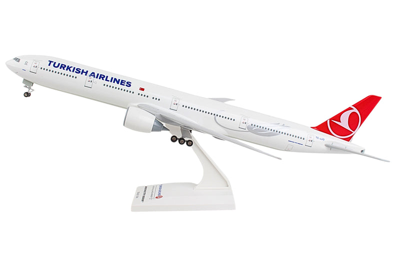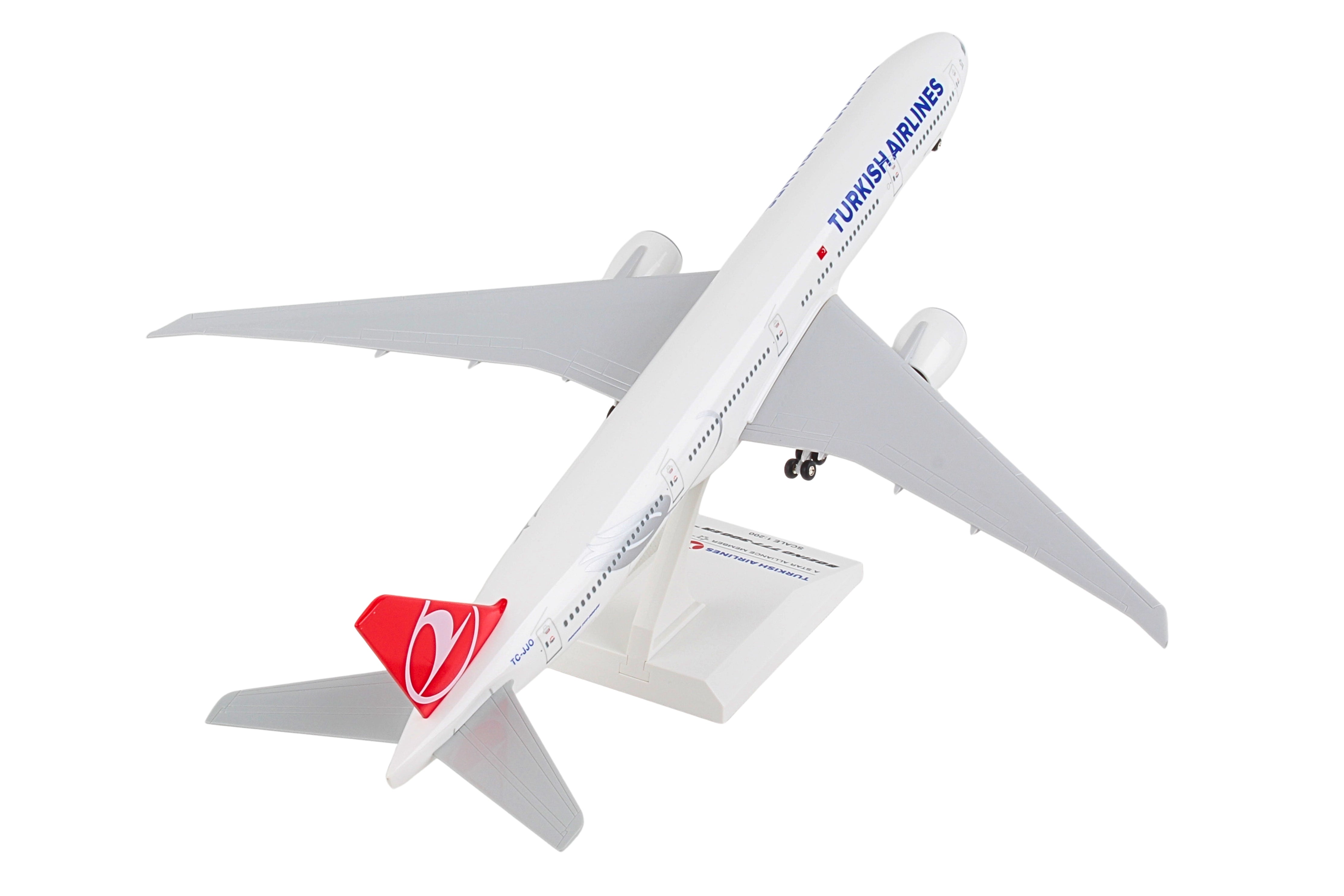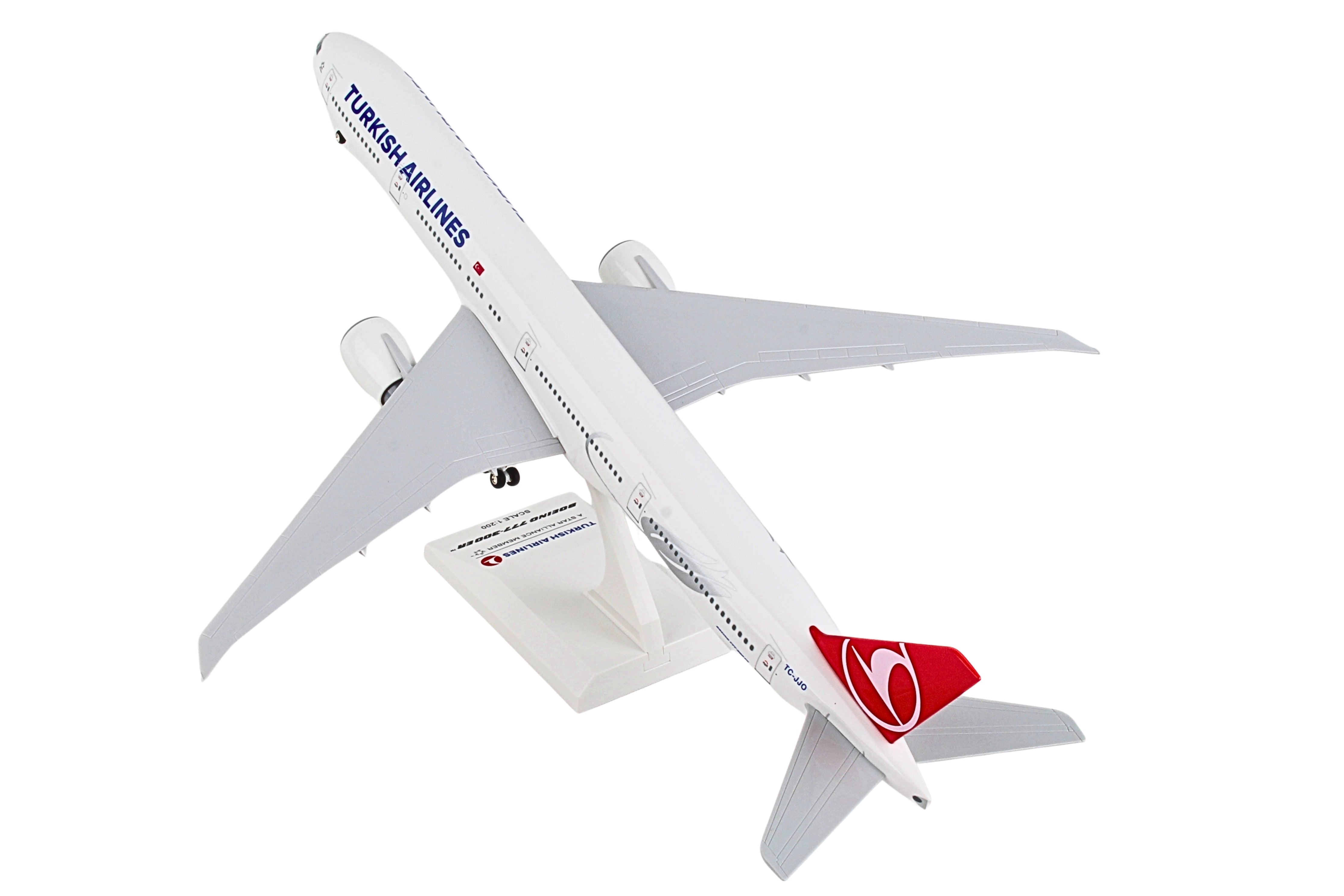 Comprising superior quality, solid, substantial injection molded plastic components with a simple snap-fit design that allows for easy assembly without the need for glue, this SkyMarks 1/200 scale Turkish Airlines Boeing 777-300ER, with Registration TC-JJO, measures approximately 14-3/8-inches long with a 12-3/4-inch wingspan and comes complete with Landing Gear and a Display Stand. An accurate, true-to-scale reproduction of the actual aircraft, the model is great for collectors and features authentic, highly detailed graphics and markings. Currently the most "ordered and delivered" widebody airliner flying today, even having overtaken the Queen of the Skies, the iconic Boeing 747, the Boeing 777 is a wide-body, twin-engine, long-range airliner that was conceived by Boeing in 1990 not only to bridge the existing gap between its 767 and 747 aircraft, but also to replace the aging DC-10s and L-1011s that were nearing retirement with a modern, more fuel efficient aircraft. Able to accommodate up to 396 passengers with ten abreast seating in a conventional 2 class configuration, the Boeing 777-300ER (Extended Range version), which went into service in April 2004 with Air France as its launch customer, not only has additional fuel capacity as well as an increased Maximum Takeoff Weight over the standard Boeing 777-300 - for a range of 7,310 nautical miles - it is also more fuel efficient and has lower operating and maintenance costs than some other rival aircraft in its class produced by both Boeing and Airbus, further bolstering its popularity with airlines seeking new aircraft.