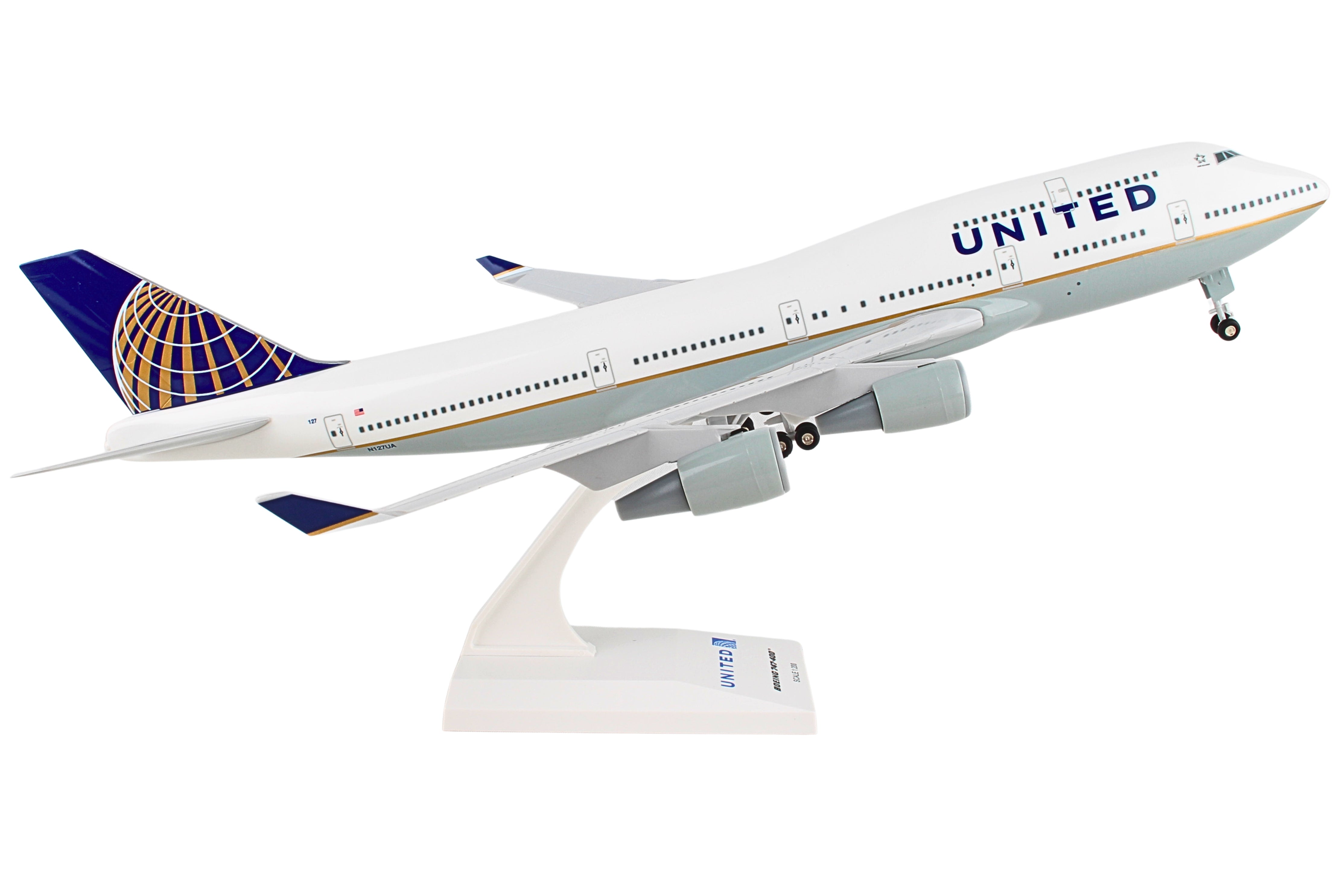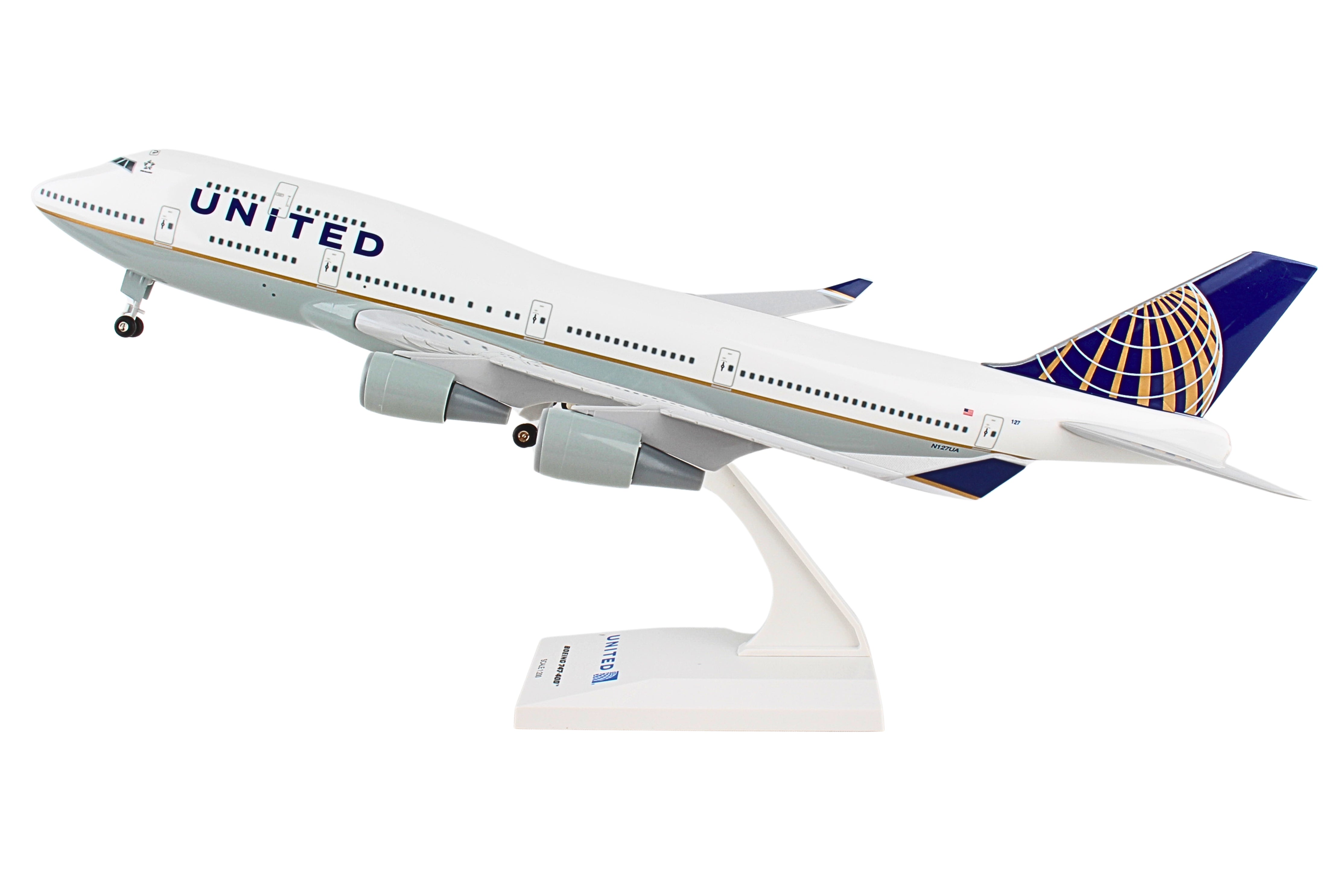 Comprising superior quality, solid, substantial injection molded plastic components with a simple snap-fit design that allows for easy assembly without the need for glue, this SkyMarks 1/200 scale United Airlines Boeing 747-400 - Registration N127UA - measures approximately 13-7/8-inches long with a 12-7/8-inch wingspan and comes complete with Landing Gear and a Display Stand. An accurate, true-to-scale reproduction of the actual aircraft, the model is great for collectors and features authentic, highly detailed graphics and markings. Easily discernible from earlier 747 models by its prominent wingtip extensions and winglets, the Boeing 747-400 was initially introduced in 1984 as an advanced variant of its predecessor, the Boeing 747-300 - known as the Advanced 300 Series - as it was intended to be more cost-effective than the -300, with more efficient engines, a greater range, at nearly 7,300 nautical miles, and due to the development and implementation of a "glass cockpit," it did away with the need for a flight engineer, consequently enabling the aircraft to be flown by a two person crew. Northwest Airlines was the launch customer for the Boeing 747-400, which entered service in February 1989. With 694 Boeing 747-400 aircraft having been produced over the course of its 20-year run from 1989 until 2009, replaced by newer, more efficient twin-engine aircraft - the Boeing 777, Boeing 787 and the Airbus A350 - the Boeing 747-400, which was offered in passenger, freighter, combi, domestic, extended range passenger and extended range freighter versions, was the bestselling version of the Boeing 747. Readily recognized around the world by its iconic large hump atop the front of its fuselage, the Boeing 747, nicknamed - Jumbo Jet - entered service in 1970 with Pan Am as the first wide-body airliner, and has primarily been used for long range passenger travel. Although capable of accommodating from 416 passengers up to 624 passengers, depending on its seating configuration, because this large, quad-engine jet was conceived in the mid-1960s, when supersonic transports were also concurrently on the drawing board, and viewed more favorably at the time as the likely successor for the future travel, Boeing engineers and Pan Am CEO, Juan Trippe opted for the Boeing 747 to be designed so that it could be readily converted into a freighter if required by merely retrofitting the fixed nose of the existing passenger aircraft with a large hinged cargo door. Consequently, if a passenger 747 aircraft were ever to be adapted as a cargo plane with a hinged cargo door, it would be much more cost effective and considerably easier to convert existing passenger aircraft into cargo aircraft if the cockpit were located above the nose, thus enabling the existing passenger 747s to continue flying as transformed cargo planes. Even though supersonic transports did not readily materialize for the most part, and did not supersede the Boeing 747 as initially envisioned, over the course of time, the Boeing 747 was not only embraced as a successful passenger and cargo aircraft, many passenger Boeing 747 aircraft were ultimately converted into cargo 747 aircraft, known as BCF - Boeing Converted Freighter(s) when it was no longer viable that they continue to be used as passenger aircraft.