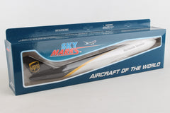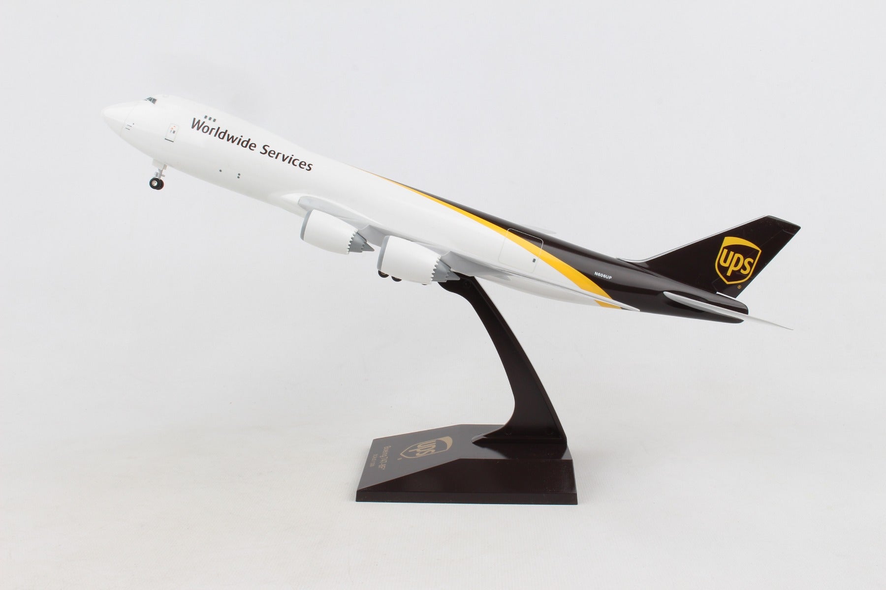 Comprising superior quality, solid, substantial injection molded plastic components with a simple snap-fit design that allows for easy assembly without the need for glue, this SkyMarks 1/200 scale UPS Boeing 747-8F - with Registration N606UP - measures approximately 15-1/16-inches long with a 13-5/8-inch wingspan and comes complete with Landing Gear and a Display Stand. An accurate, true-to-scale reproduction of the actual aircraft, the model is great for collectors and features authentic, highly detailed graphics and markings. Easily discernible from earlier 747 models by its prominently curved aerodynamic wings with raked back wingtips and chevrons on its engine nacelles, the Boeing 747-8 was initially introduced in 2005 as a larger, quieter and more advanced and fuel-efficient variant of its predecessor, the Boeing 747-400, and utilizes the same cockpit and engine technology as its sibling, the Boeing 787, which is acknowledged by the suffix, 8 after 747 (747-8F), with the "F" designating it as a "Freighter." Unlike the passenger version of the Boeing 747-8i, which can carry more than 400 passengers in a 3-class configuration, the Boeing 747-8F freighter variant not only has a noticeably shorter upper deck, it is manufactured with a hinged opening nose door along with a side door on the main deck and a side door on the lower deck to facilitate loading and unloading the aircraft. The Boeing 747-8F also boasts a greater payload capacity than its predecessor, the Boeing 747-400ERF, the aircraft from which it was derived. The first 787-8F (Freighter) was delivered to launch customer, Cargolux in late 2011. Interestingly, the large, quad-engine Boeing 747 was initially conceived in the mid-1960s, when supersonic transports were also concurrently on the drawing board, and viewed more favorably at the time as the likely successor for the future travel, Boeing engineers and Pan Am CEO, Juan Trippe opted for the Boeing 747 to be designed so that it could be readily converted into a freighter by merely retrofitting the fixed nose of the existing passenger aircraft with a large hinged cargo door. Consequently, if a passenger 747 aircraft were ever to be adapted as a cargo version with a hinged cargo door, it would be much more cost effective and considerably easier to convert existing passenger aircraft into cargo aircraft if the cockpit were located above the nose, thus enabling existing passenger 747s to continue flying as transformed cargo planes. Even though supersonic transports did not readily materialize for the most part, and did not supersede the Boeing 747 as initially envisioned, over time, the Boeing 747 was not only embraced as a successful passenger and cargo aircraft, many passenger Boeing 747 aircraft were ultimately converted into cargo 747 aircraft, known as BCF - Boeing Converted Freighter(s) when it was no longer viable that they continue to be used as passenger aircraft.