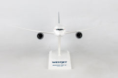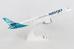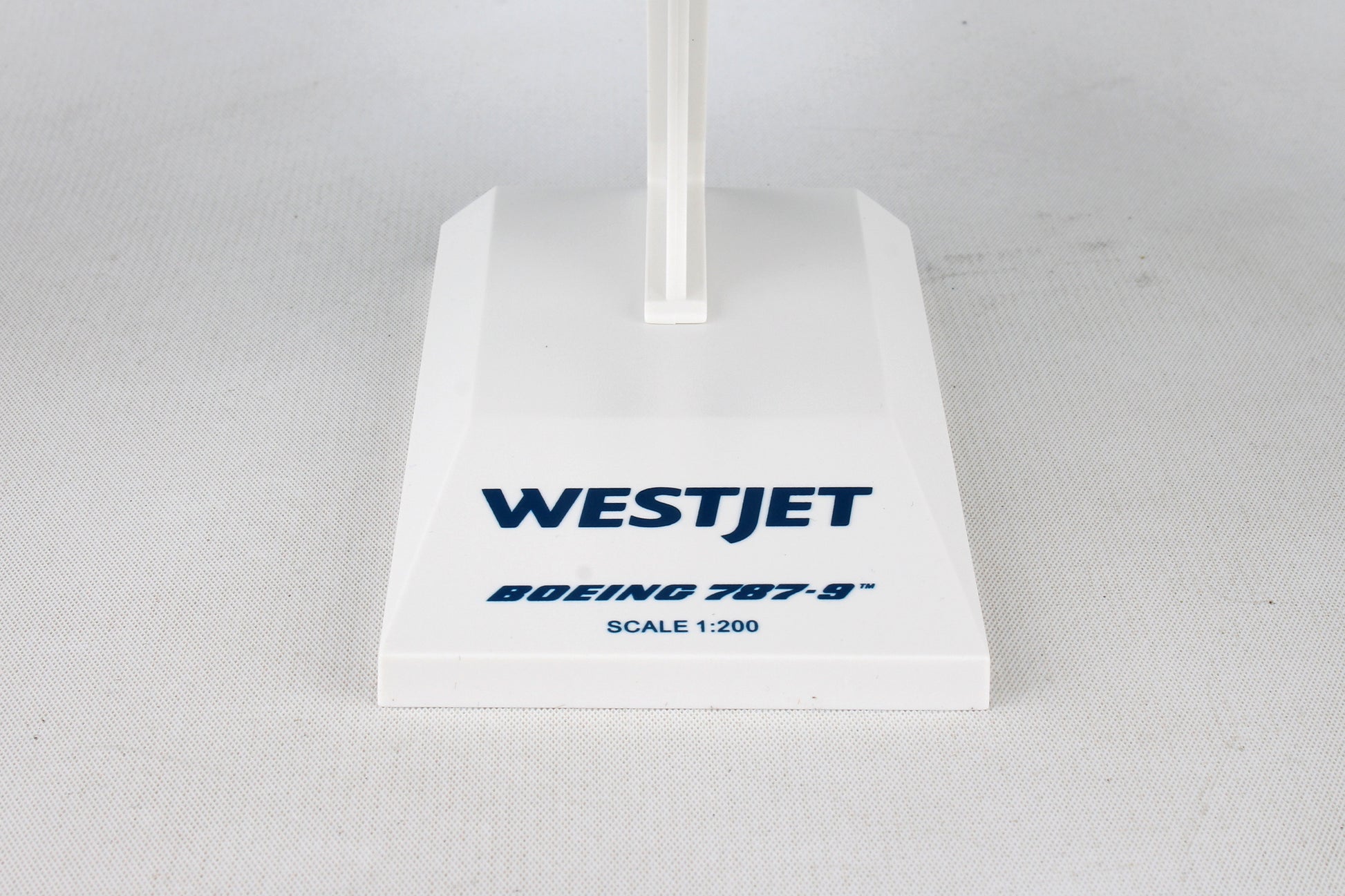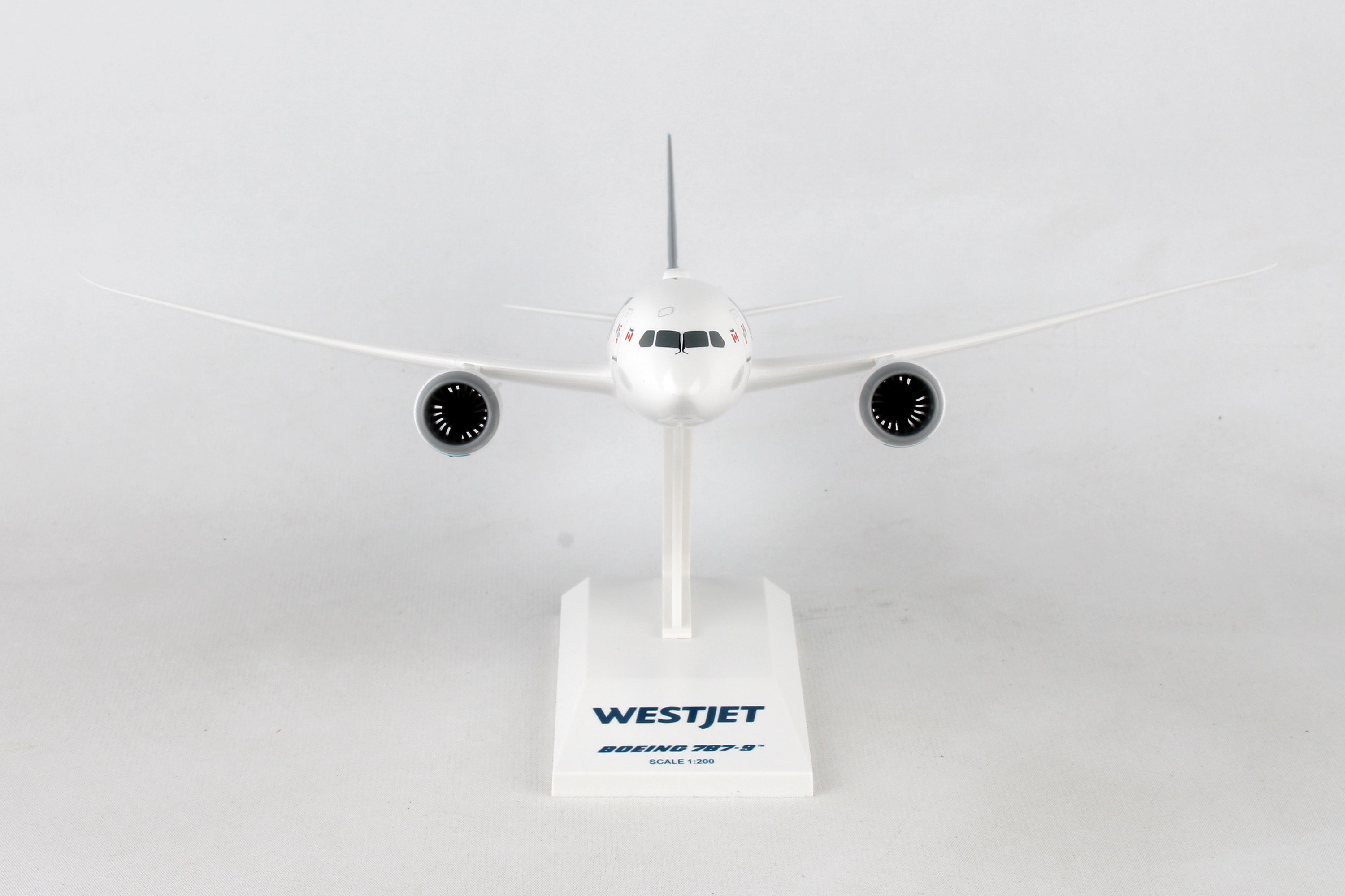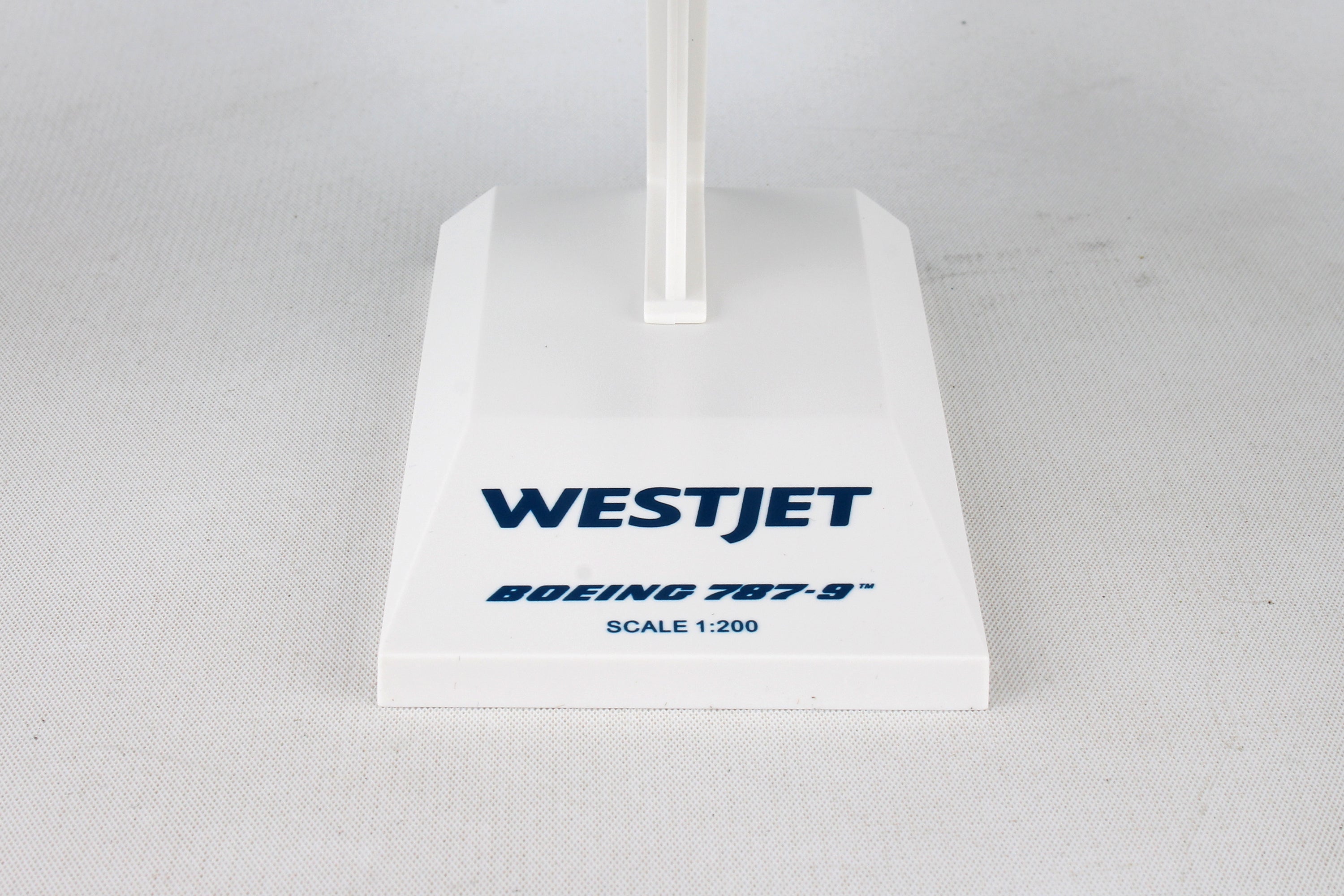 Comprising superior quality, solid, substantial injection molded plastic components with a simple snap-fit design that allows for easy assembly without the need for glue, this SkyMarks 1/200 Scale WestJet Boeing 787-9 Dreamliner - Registration C-GUDH - measures approximately 12-3/8-inches long with a 12-1/8-inch wingspan and comes complete with a Display Stand. An accurate, true-to-scale reproduction of the actual aircraft, the model is great for collectors and features authentic, highly detailed graphics and markings. Having commenced service with the introduction of the Boeing 787-8 Dreamliner in 2011 as a more fuel-efficient, environmentally friendly successor to the aging Boeing 767, as market demand for the Boeing 747 and 767 had begun to slow down, the innovative, twin engine, wide-body Boeing 787 Dreamliner is currently offered in three different versions that can be configured to seat from 248 up to 336 passengers and is recognized by its prominently curved aerodynamic wings with raked back wingtips and chevrons on its engine nacelles. Technologically advanced with state-of-the-art avionics, electronics systems and an airframe that primarily comprises lightweight composite materials, the Boeing 787 Dreamliner can fly ultra-long-haul, non-stop, point-to-point routes up to 8,500 nautical miles where bigger aircraft cannot be accommodated or are financially justifiable, and offers improved cabin noise and oxygen levels, larger windows, and a very spacious interior design for maximum flying pleasure. Intended to replace the aging Boeing 767-300ER, the Boeing 787-9, which went into service in 2014, is a lengthened version of the launch version Boeing 787-8 with a higher maximum takeoff weight, and because of its increased range over the launch model, can fly 296 passengers to an even greater number of non-stop routes with exceptional efficiency.