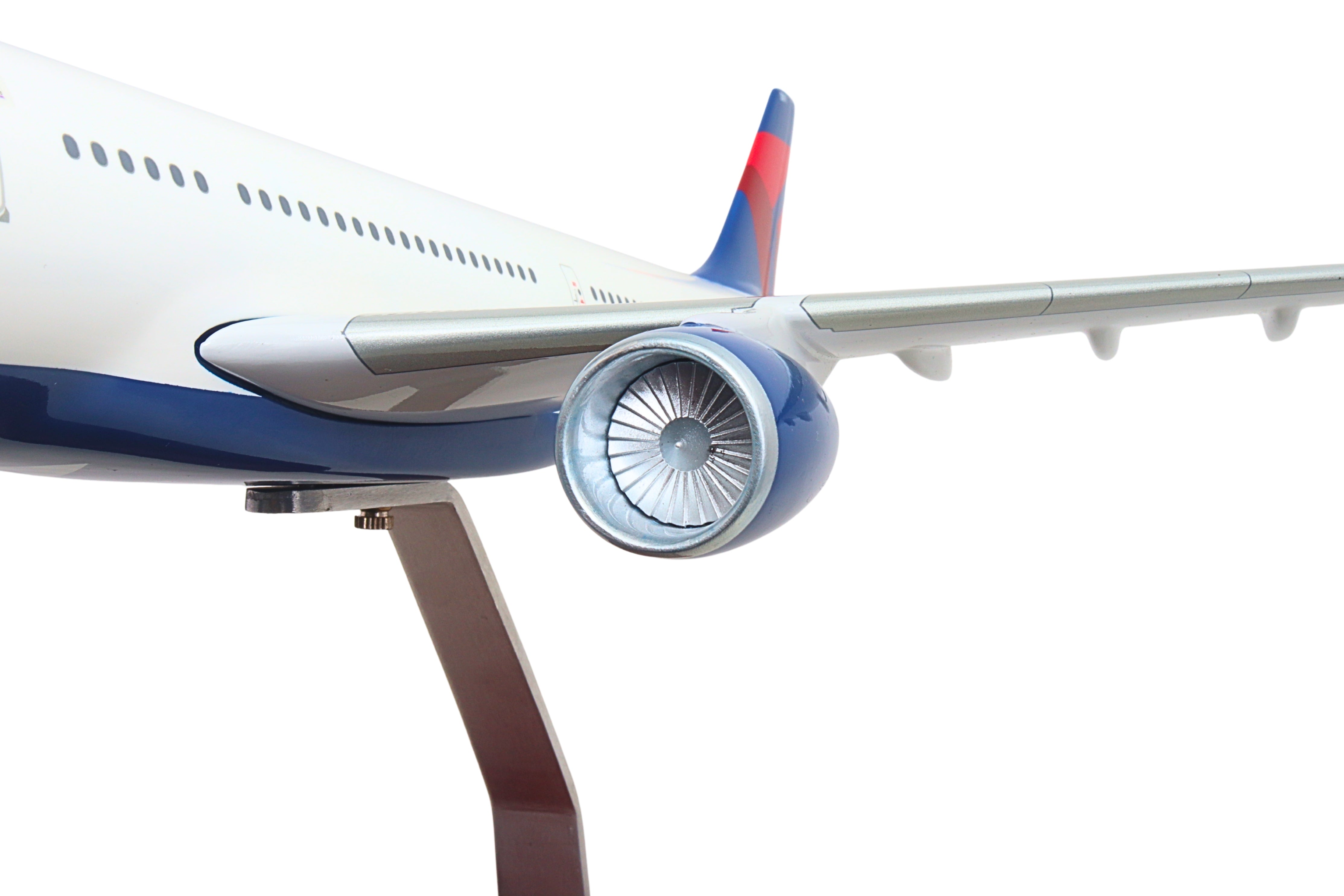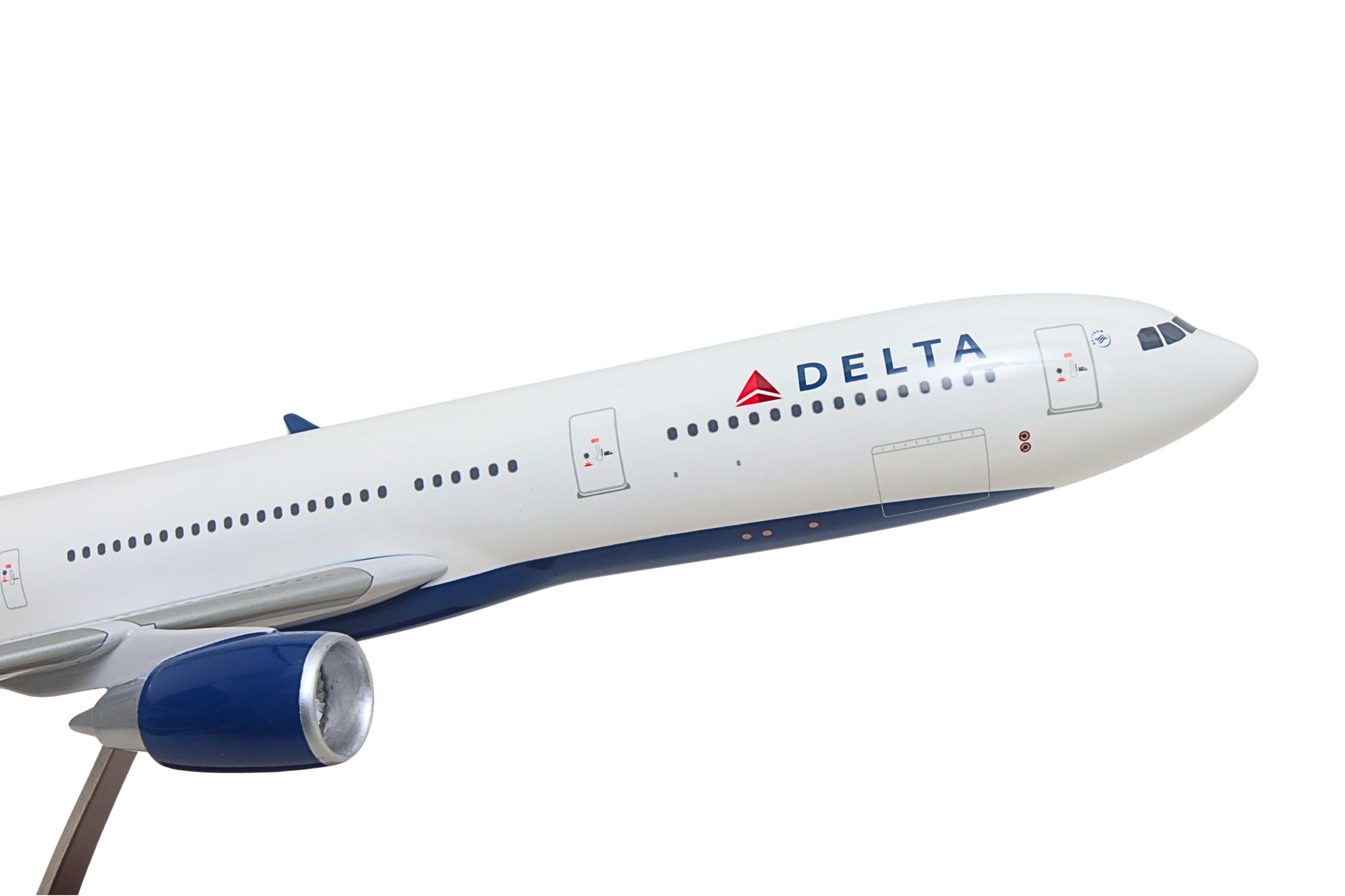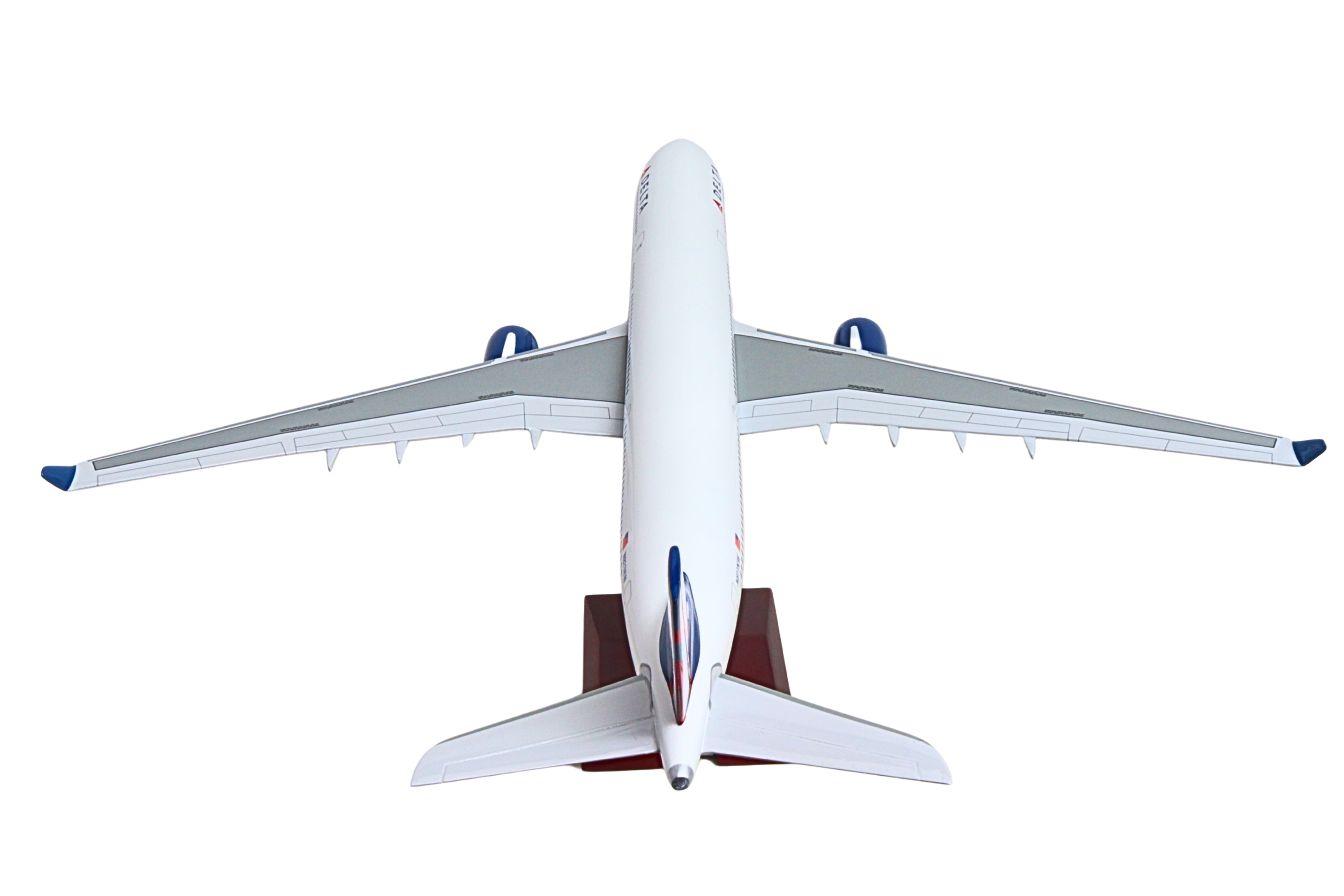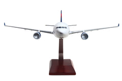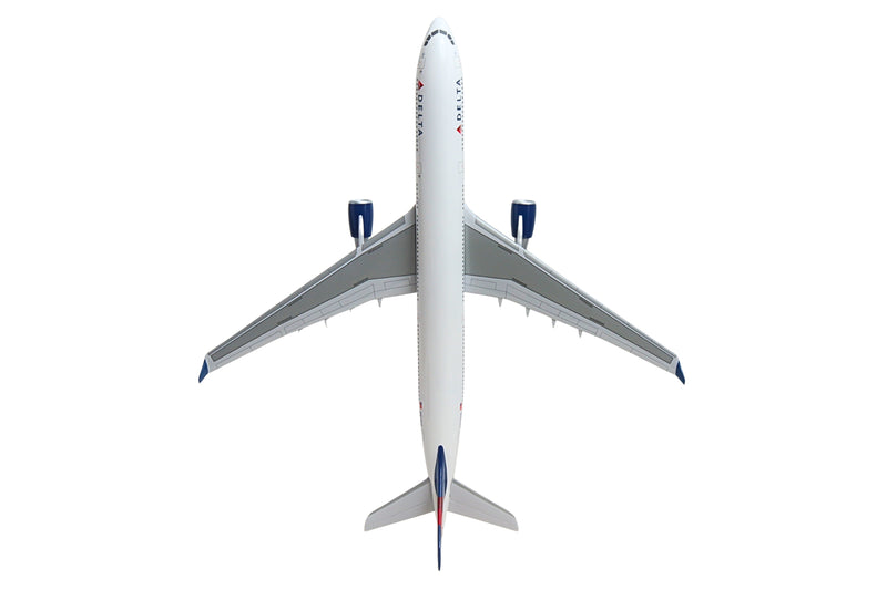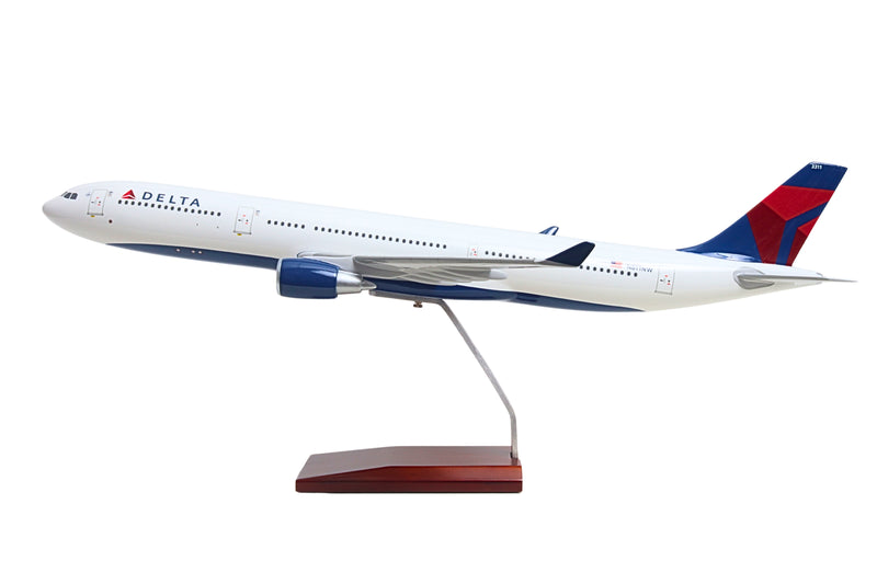 This resin airplane model with wooden display stand is faithfully painted in Delta Airline's livery, and includes landing gear, adding to its authenticity. Made in 1/100 scale, the model features highly detailed graphics and assembles in minutes. Recommended for ages 14+ The twin-engine widebody Airbus A330-300 can seat between 250 to 290 passengers in a typical layout and as many as 440 passengers in an expanded arrangement, providing airlines with scheduling flexibility to fly all types of routes from short-haul trips to long-haul destinations, enabling it to serve big city airports, airport hubs, and significant secondary destinations. The red, white, and navy-blue colors of the Delta livery reflect the importance of Delta to America's aerial heritage. From being the first flying crop-duster operation, training WW2 pilots, and being among the first airlines to have a team of flight attendants and introduce a frequent flyer program, Delta is at the forefront of the airline industry's development.