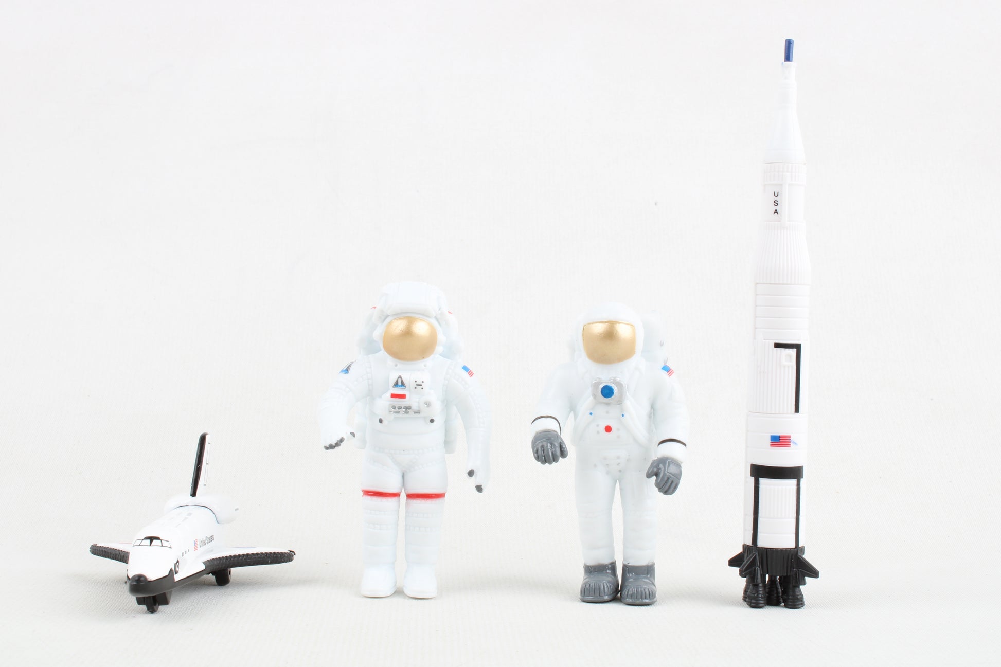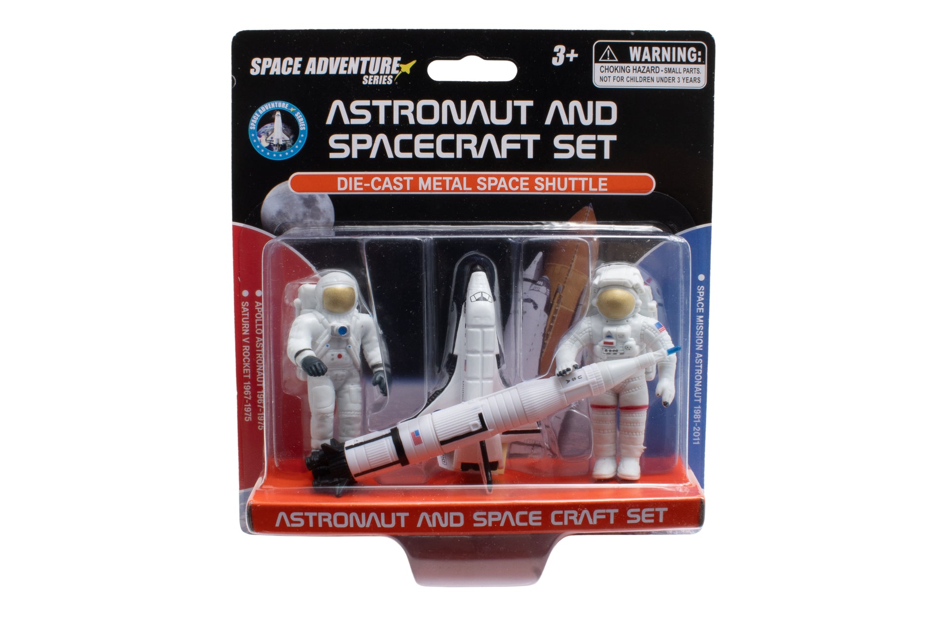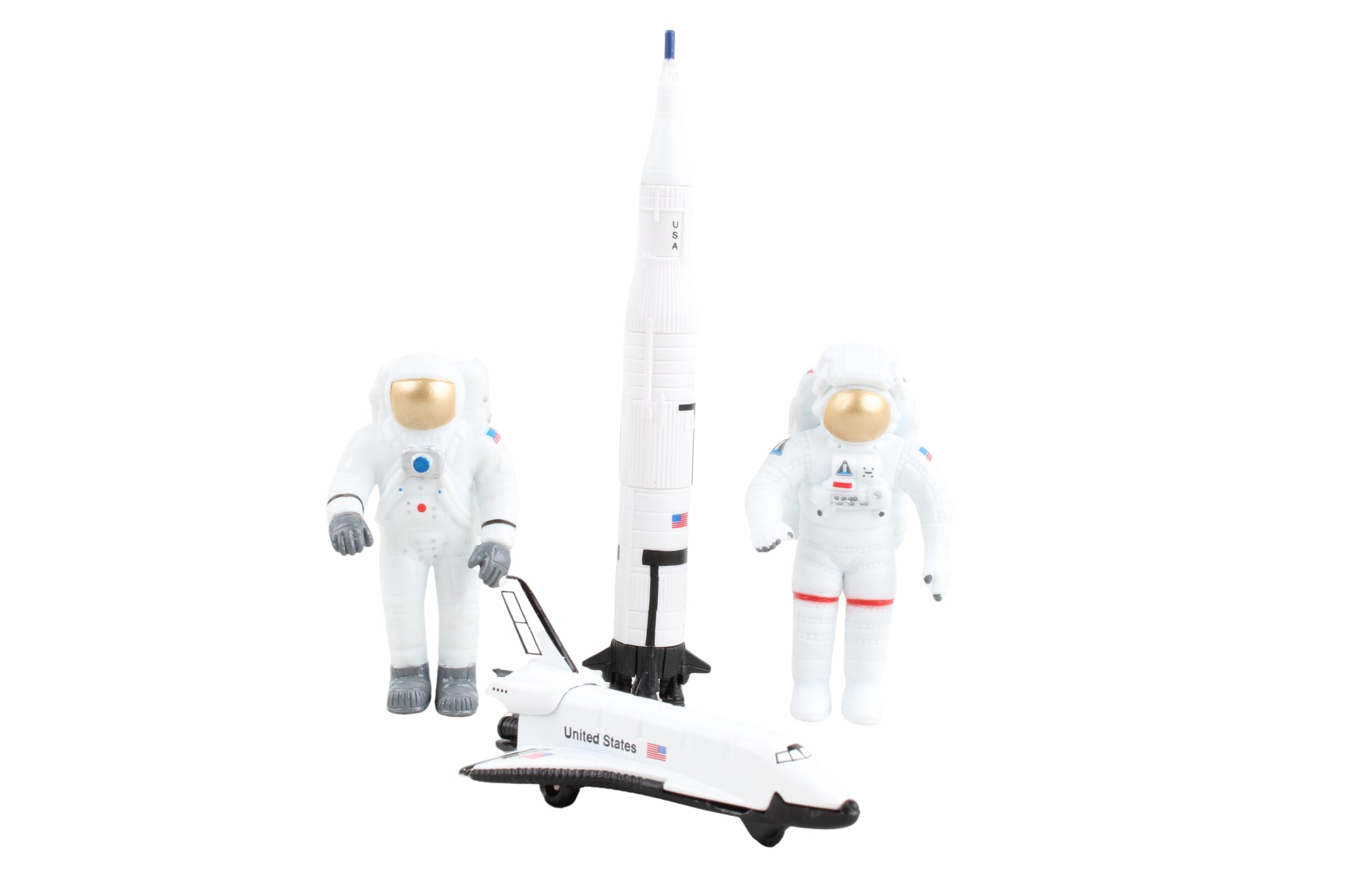 A world of wonder and discovery awaits with 5-piece set that lets kids imagine space exploration adventures! Made from die-cast metal and plastic parts, this comes complete with two poseable astronaut figures and two spacecraft, including a replica of the Saturn V Rocket, and the Space Shuttle, designed to inspire kids' imaginations to create their own space mission adventures. One astronaut has a spacesuit that reflects the ones worn by astronauts who went on Apollo missions from 1967-1975, and the other astronaut's spacesuit matches those who explored space in Space Shuttle missions from 1981-2011. Each spacecraft is an authentically detailed representation of real-life astronautic equipment, featuring the American flag and licensed logo designs from NASA. Also included are easy-to-apply stickers that allow children to add the name of their favorite Space Shuttle to the spacecraft. Prepare the launchpad for liftoff and get the space mission started! 5-piece playset of two poseable astronaut figures and two spacecraft made from die-cast metal and plastic materials, plus stickers. The astronauts and spacecraft are inspired by special NASA space missions. The Saturn V rocket was used in the Apollo mission to land humans on the moon and launch the first American space station, Skylab. Flying 135 missions, the Space Shuttle launched satellites and interplanetary probes, conducted science experiments in orbit, and collaborated with Russian Cosmonauts in the Shuttle-Mir Program. Its most famous accomplishments were launching the Hubble Space Telescope (HST) and helping to build the International Space Station (ISS). Recommended for children Ages 3+.
