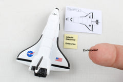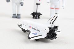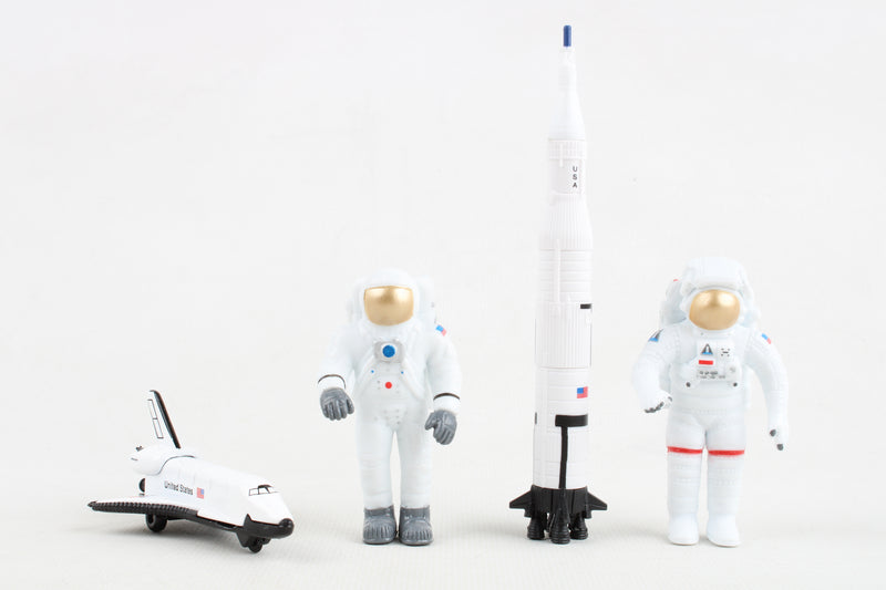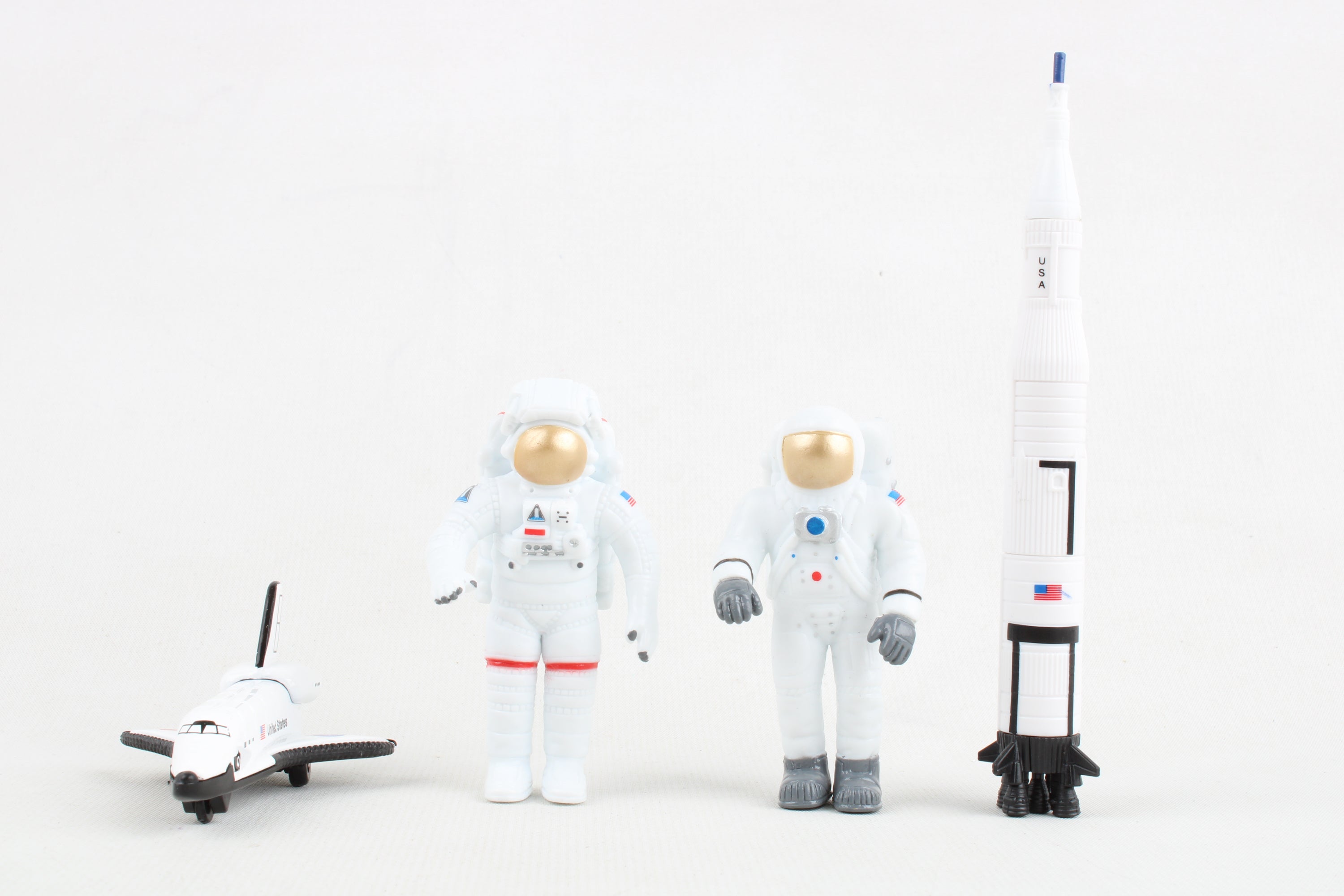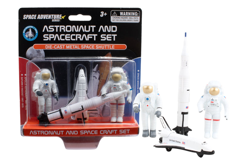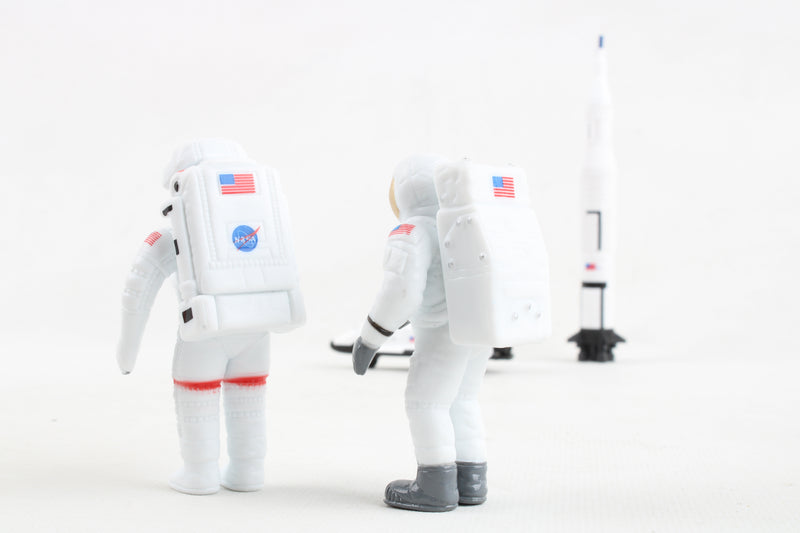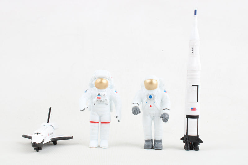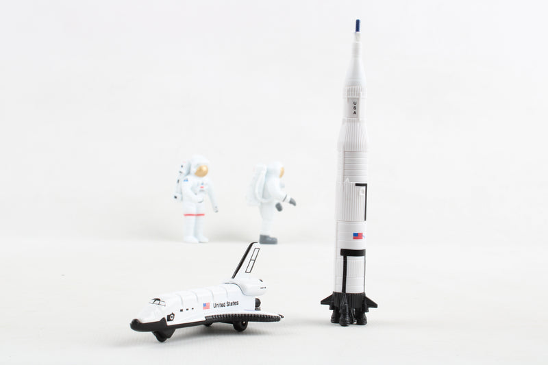 A world of wonder and discovery awaits with 5-piece set that lets kids imagine space exploration adventures! Made from die-cast metal and plastic parts, this comes complete with two poseable astronaut figures and two spacecraft, including a replica of the Saturn V Rocket, and the Space Shuttle, designed to inspire kids' imaginations to create their own space mission adventures. One astronaut has a spacesuit that reflects the ones worn by astronauts who went on Apollo missions from 1967-1975, and the other astronaut's spacesuit matches those who explored space in Space Shuttle missions from 1981-2011. Each spacecraft is an authentically detailed representation of real-life astronautic equipment, featuring the American flag and licensed logo designs from NASA. Also included are easy-to-apply stickers that allow children to add the name of their favorite Space Shuttle to the spacecraft. Prepare the launchpad for liftoff and get the space mission started! 5-piece playset of two poseable astronaut figures and two spacecraft made from die-cast metal and plastic materials, plus stickers. The astronauts and spacecraft are inspired by special NASA space missions. The Saturn V rocket was used in the Apollo mission to land humans on the moon and launch the first American space station, Skylab. Flying 135 missions, the Space Shuttle launched satellites and interplanetary probes, conducted science experiments in orbit, and collaborated with Russian Cosmonauts in the Shuttle-Mir Program. Its most famous accomplishments were launching the Hubble Space Telescope (HST) and helping to build the International Space Station (ISS). Recommended for children Ages 3+.