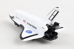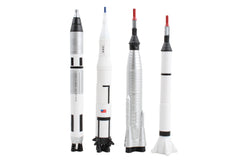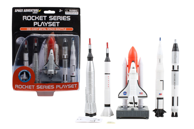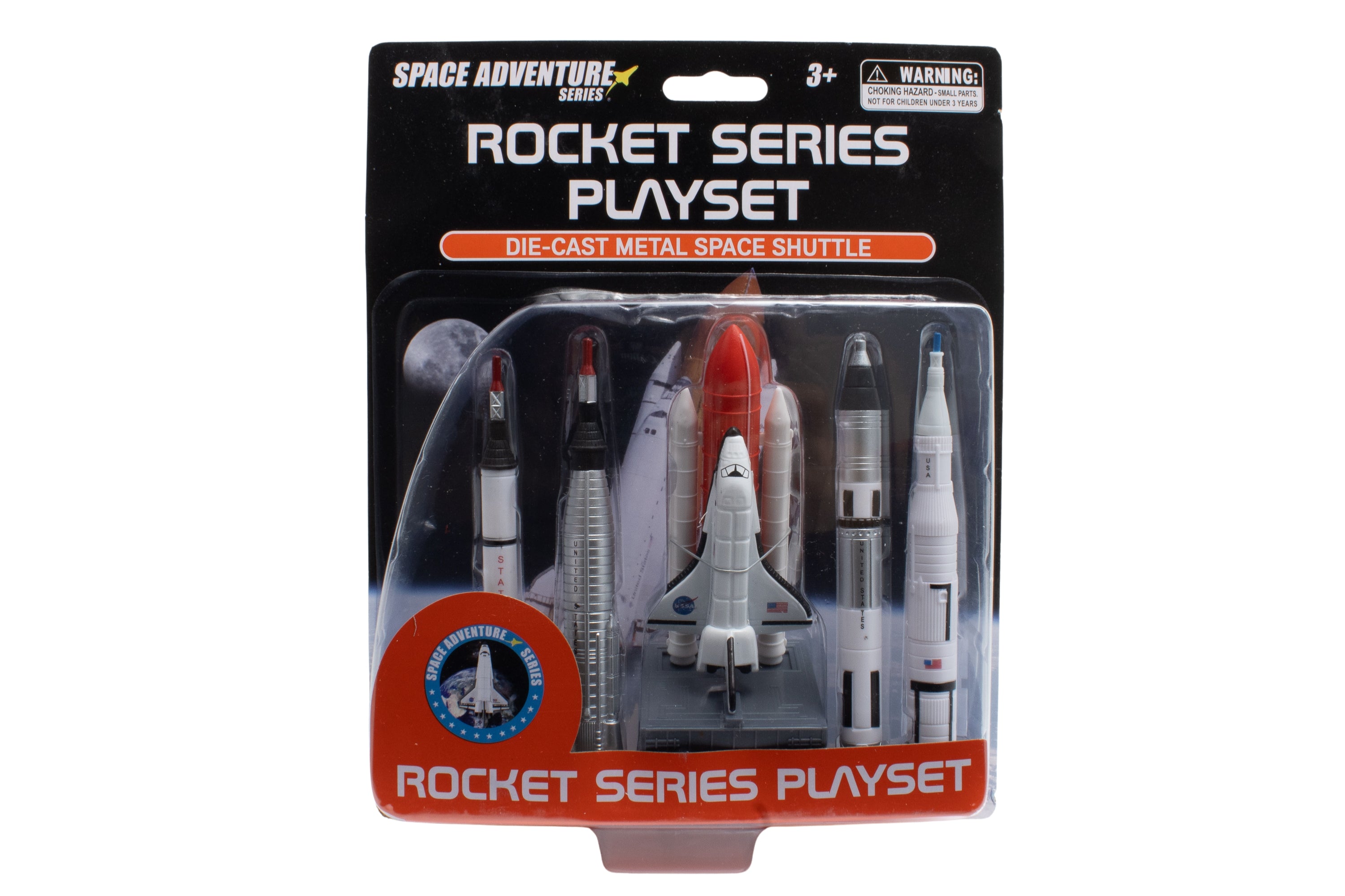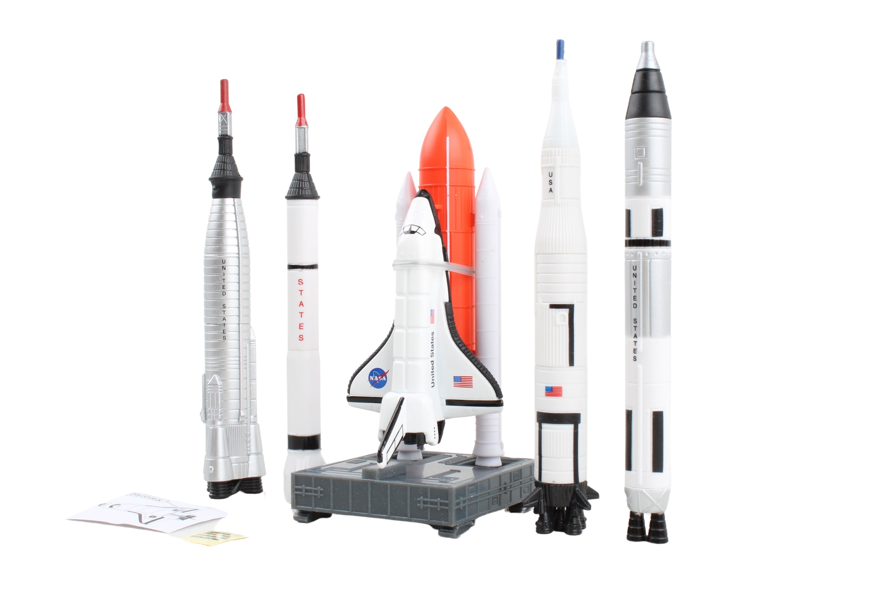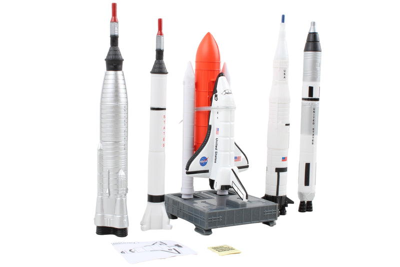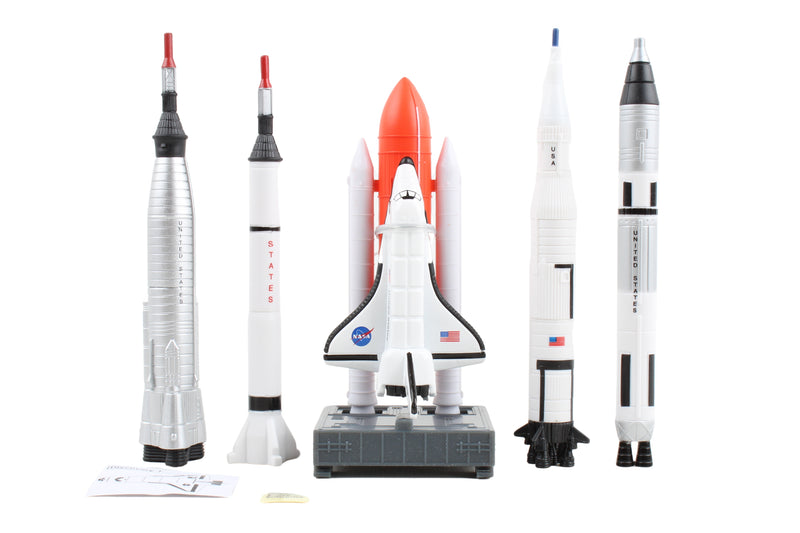 Line up your spacecraft and get ready to blast off into adventure! Kids can imagine endless space journeys with this 5-piece set including four rockets and one space shuttle. Made from die-cast metal and plastic parts, this set comes complete with the following iconic spacecraft: Mercury Redstone, Mercury Atlas, Gemini Titan, Apollo Saturn V, and the Space Shuttle. Each spacecraft is an authentically detailed representation of real-life astronautic equipment, featuring the American flag and licensed logo designs from NASA. Prepare the launchpad for liftoff and get the space missions started! 5-piece playset of four rockets and one space shuttle made from die-cast metal and plastic materials. Recommended for children Ages 3+. The spacecrafts in this set are inspired by these iconic NASA space missions: Mercury Redstone (1960-1961): The first crewed launch vehicle in the United States space program. Mercury Atlas (1960-1963): Responsible for the first American orbital spaceflight by John Glenn (1962). Gemini Titan (1964-1966): Acted as a bridge between the Project Mercury and Apollo programs, launching an uncrewed orbital test in 1964. Apollo Saturn V (1967-1975): An expendable rocket used by NASA's Apollo and Skylab programs, the largest and most powerful launch vehicle ever brought to operational status. Space Shuttle (1981-2011): Launched satellites and interplanetary probes, conducted science experiments in orbit, collaborated with Russian Cosmonauts in the Shuttle-Mir Program, launched the Hubble Space Telescope (HST), helped build the International Space Station (ISS).