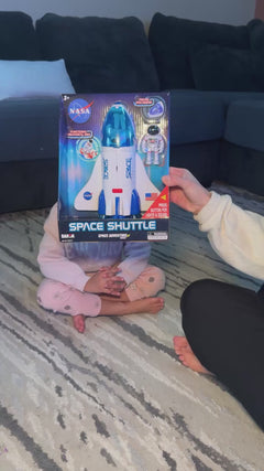 The Space Adventure Series Space Shuttle features fully functional lights, sounds, rolling wheels and an astronaut. Its payload bay doors and canopy open and close, enabling the astronaut to be placed in the pilot seat or on the operational mechanical arm within the spacecraft. Aproximately 9.5 inches x 7.5 inches, plastic. 2 X 1.5 AAA Alkaline Batteries are included. Recommended for children Ages 3+.