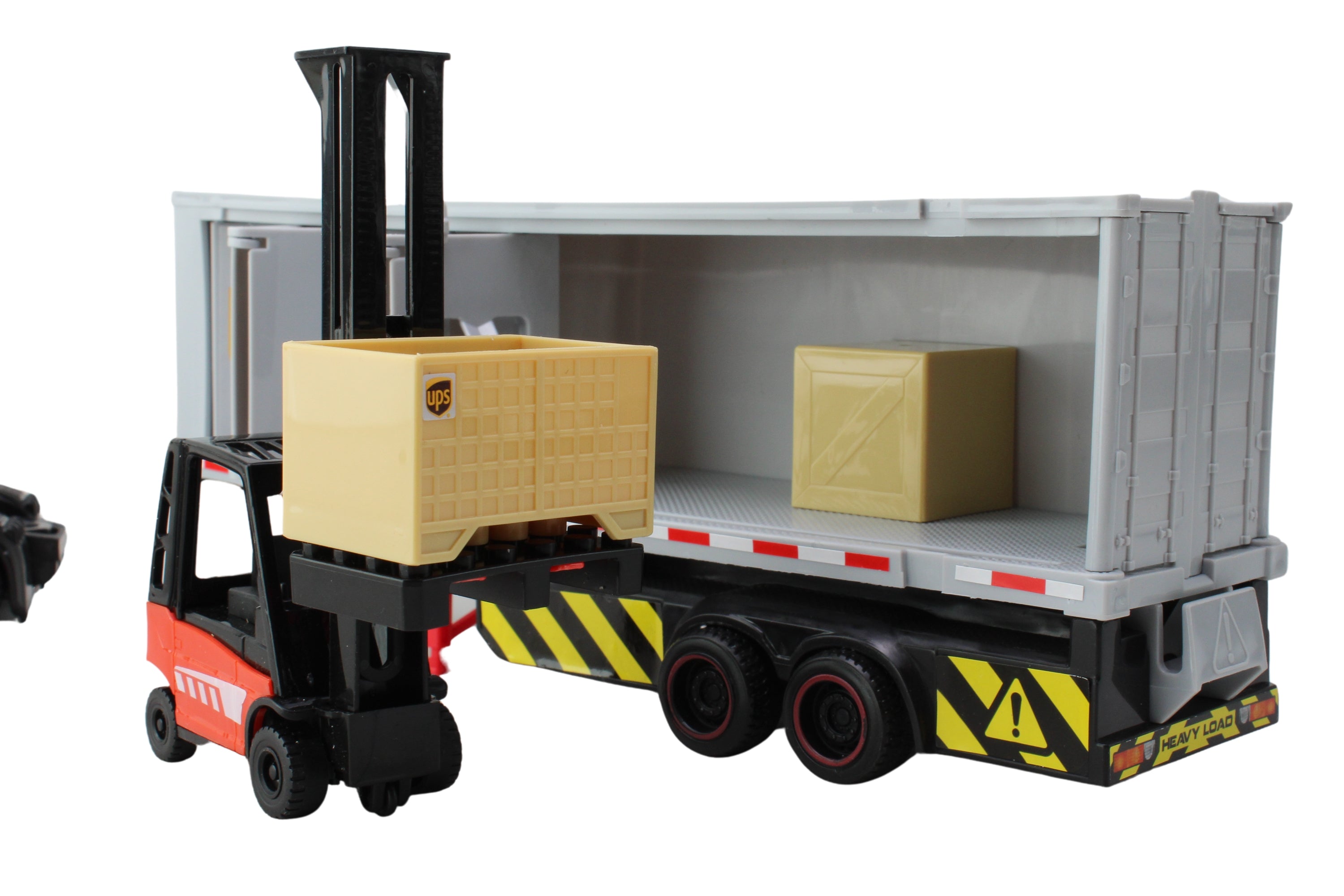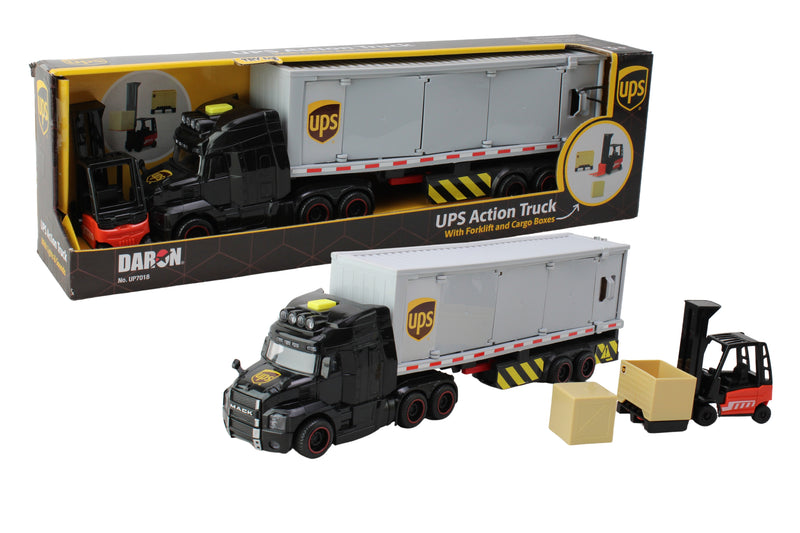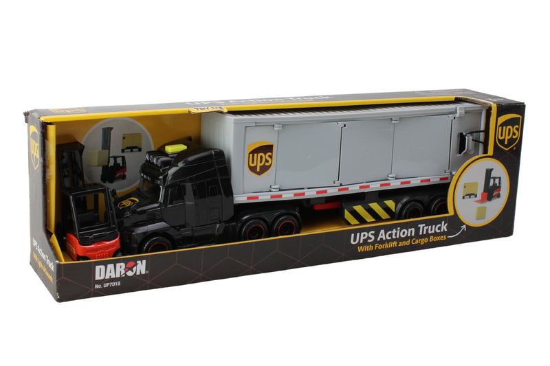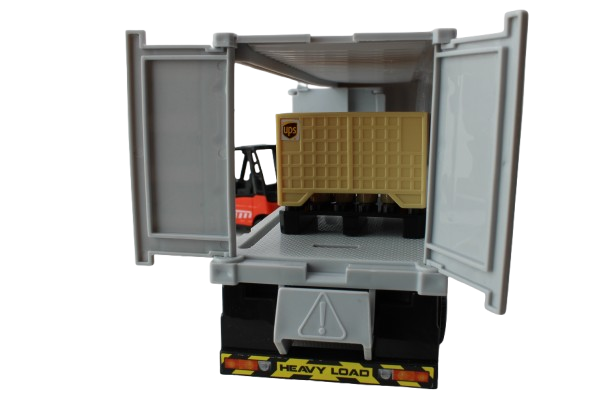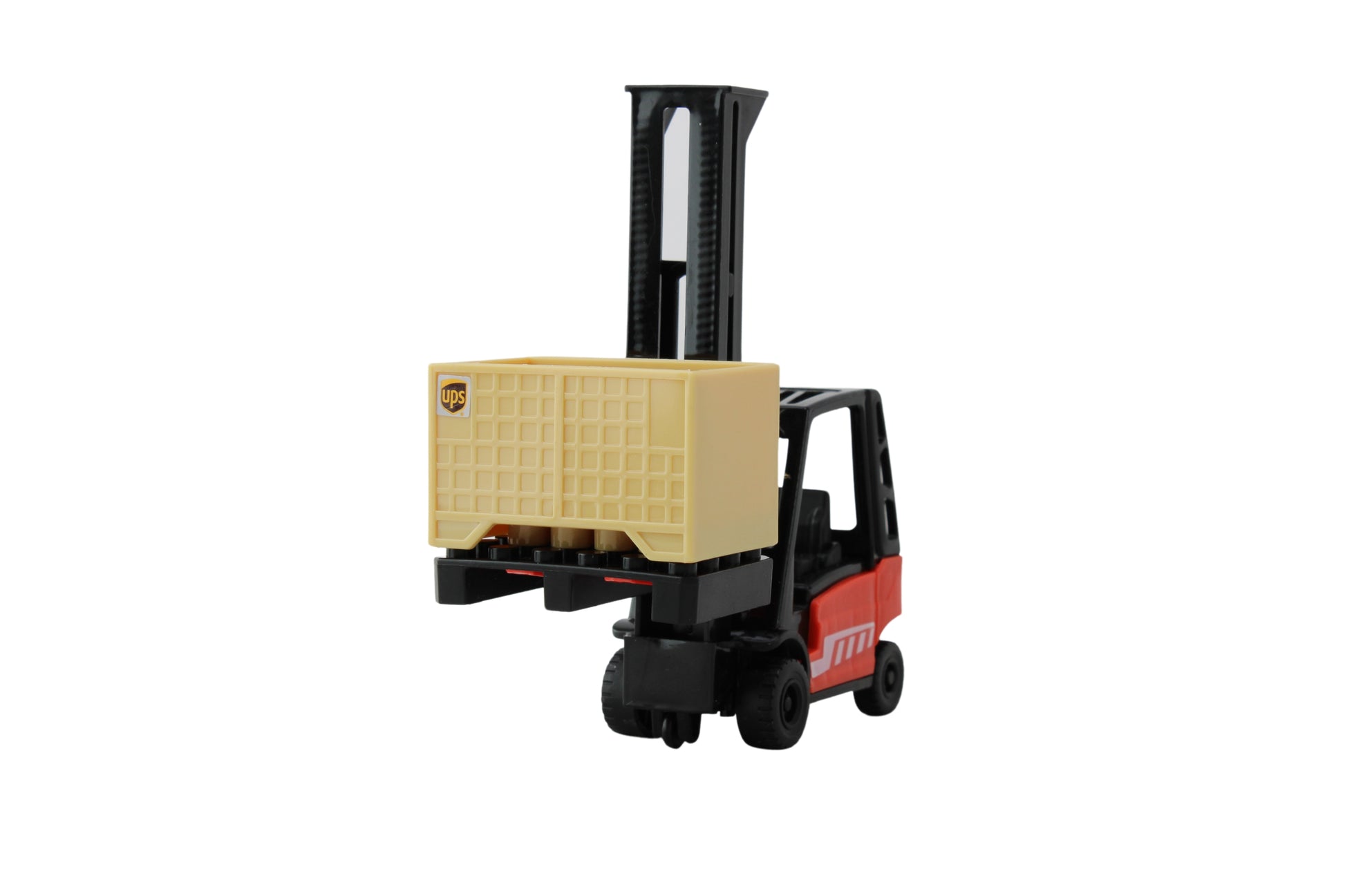 Dive into delivery adventures with our UPS Action Truck – an officially licensed UPS product for boundless imaginative play. Open the side and back doors to reveal a lifelike interior, while the freewheeling forklift, pallet, and cargo boxes provide endless possibilities for loading and unloading. The truck's smooth free-wheeling motion, combined with dynamic lights and sounds, captures the vibrant atmosphere of a bustling delivery day. Tailored for aspiring young delivery enthusiasts, this toy seamlessly blends authenticity with entertainment, making it an ideal addition to any growing adventurer's collection. Suitable for ages 3 and up.