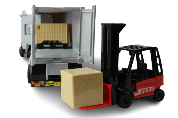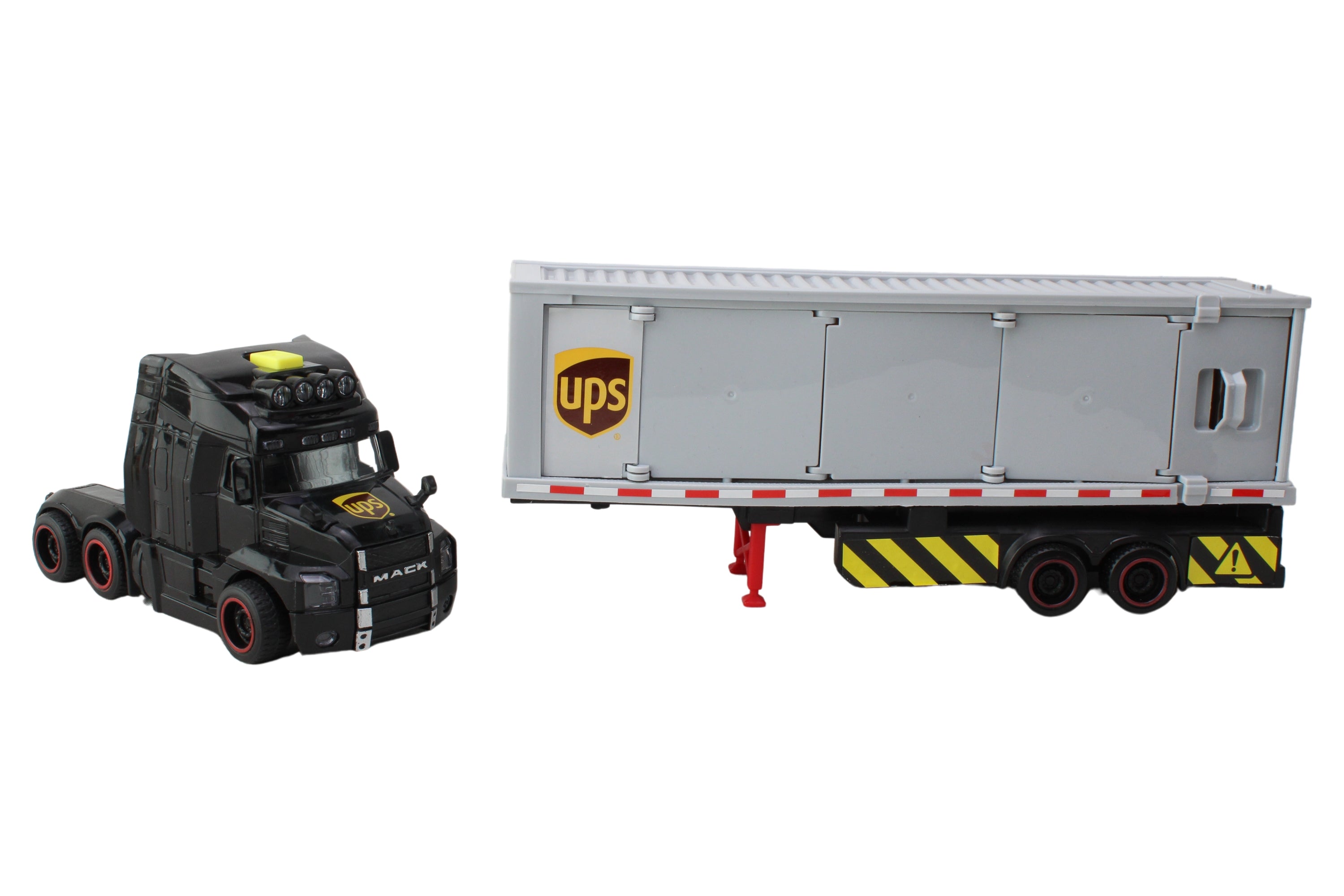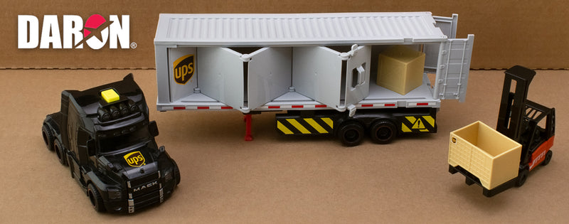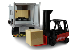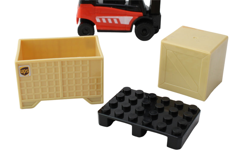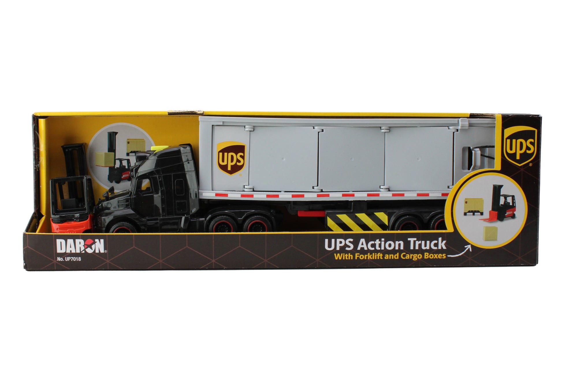Dive into delivery adventures with our UPS Action Truck – an officially licensed UPS product for boundless imaginative play. Open the side and back doors to reveal a lifelike interior, while the freewheeling forklift, pallet, and cargo boxes provide endless possibilities for loading and unloading. The truck's smooth free-wheeling motion, combined with dynamic lights and sounds, captures the vibrant atmosphere of a bustling delivery day. Tailored for aspiring young delivery enthusiasts, this toy seamlessly blends authenticity with entertainment, making it an ideal addition to any growing adventurer's collection. Suitable for ages 3 and up.